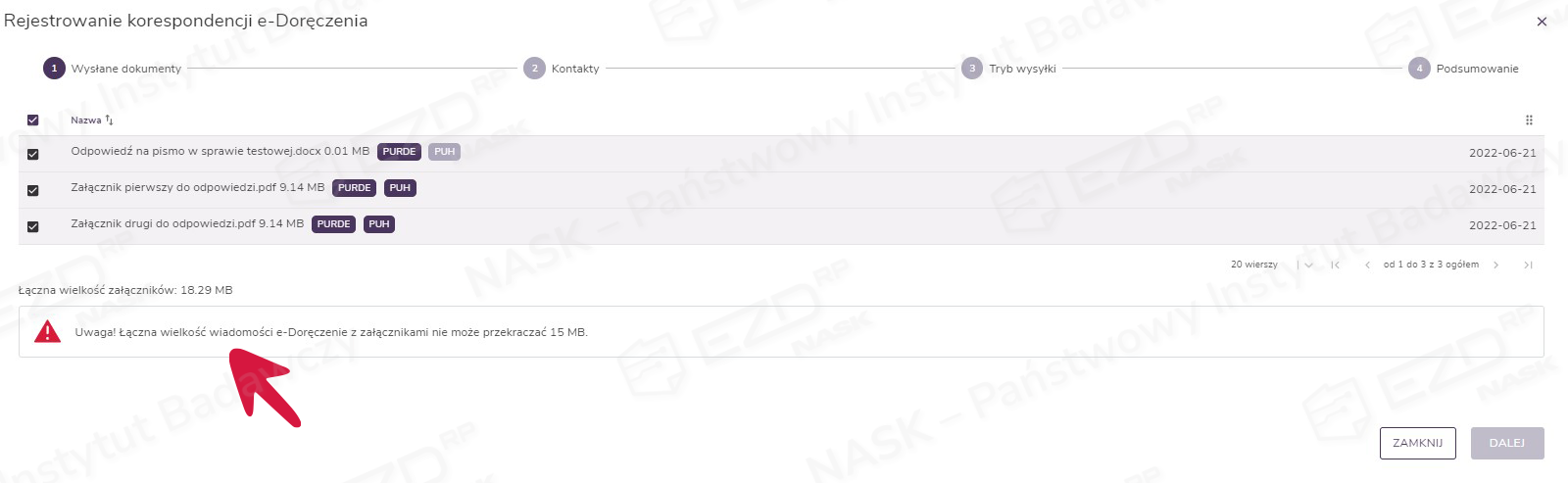 Gdy wielkość dołączonego przez użytkownika pliku lub plików przekroczy dopuszczalną wartość 15 MB, system EZD RP automatycznie wyświetli stosowny komunikat. Dalsza rejestracja wysyłki w trybie e-Doręczeń nie będzie możliwa. W takiej sytuacji należy kliknąć przycisk Zamknij i dodać pliki spełniające kryteria wysyłki.