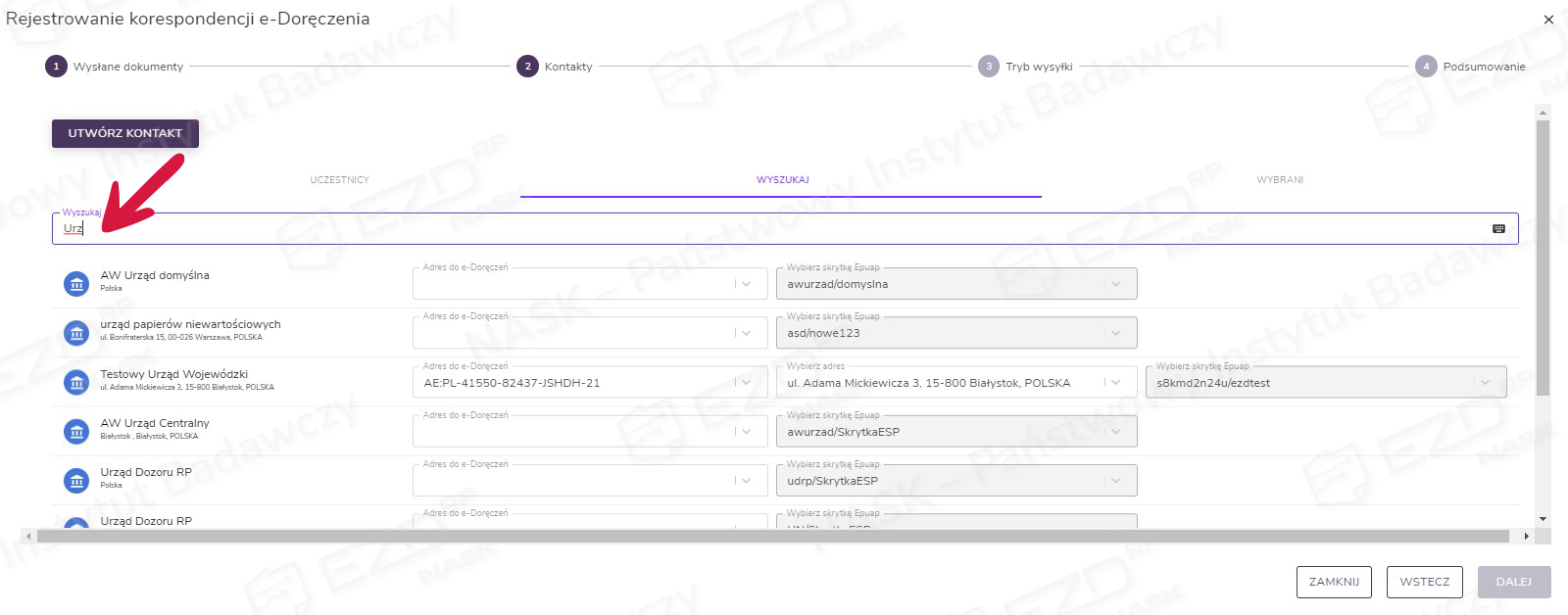Po dodaniu dokumentów i wciśnięciu przycisku Dalej przechodzimy do wyboru odbiorcy korespondencji. Dostępne są dwie opcje wyszukania kontaktu: użycie wyszukiwarki lub wskazanie kontaktu z zakładki Uczestnicy. Wskazanie kontaktu z rozwiniętej listy spowoduje przeniesienie go do zakładki Wybrani.