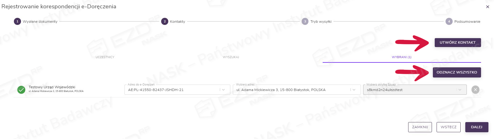 Dodatkowo na tym poziomie istnieje możliwość zmiany lub dodania adresata oraz uzupełnienia bazy kontaktów za pomocą przycisku Utwórz kontakt. Skorzystanie z przycisku Odznacz wszystko przenosi użytkownika do okna wyszukania kontaktu. Wybór kontaktu należy potwierdzić kliknięciem przycisku Dalej.