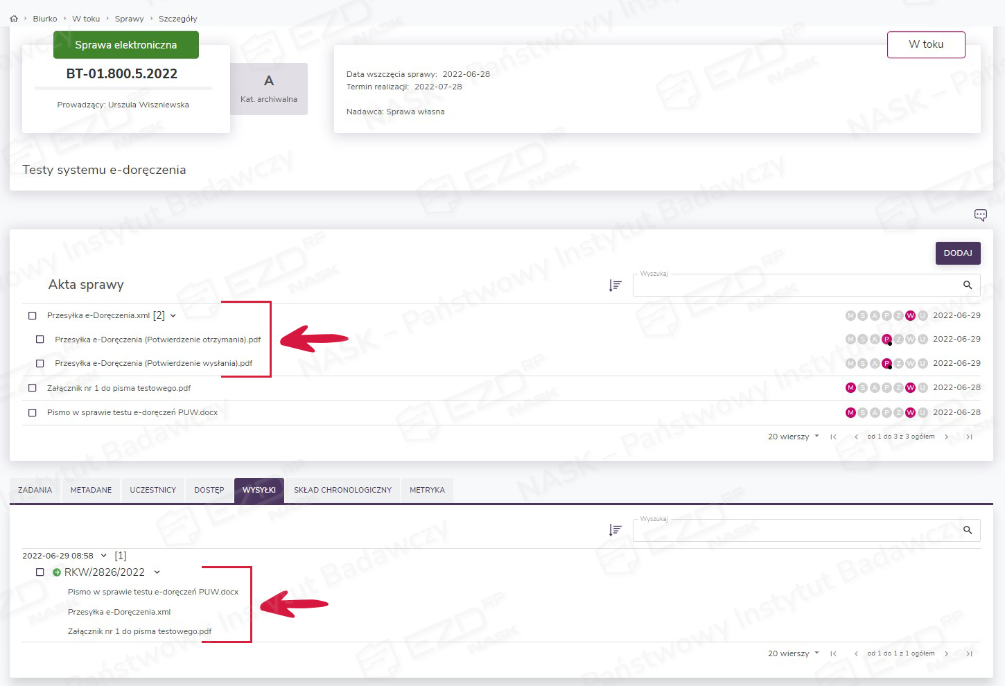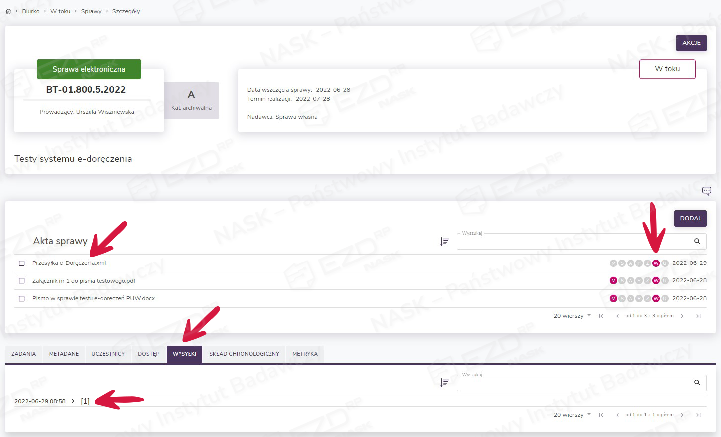 W aktach sprawy tworzy się plik w formacie XML o wcześniej wpisanym tytule (tutaj: Przesyłka e-Doręczenia) zawierający potwierdzenie wysłania korespondencji w trybie elektronicznym. Jednocześnie w szeregu ikon statusu (widocznych przy przesłanych dokumentach) zostanie kolorem wyróżniona litera W oznaczająca wygenerowanie korespondencji wychodzącej. Równocześnie odkłada się wpis w zakładce Wysyłki.