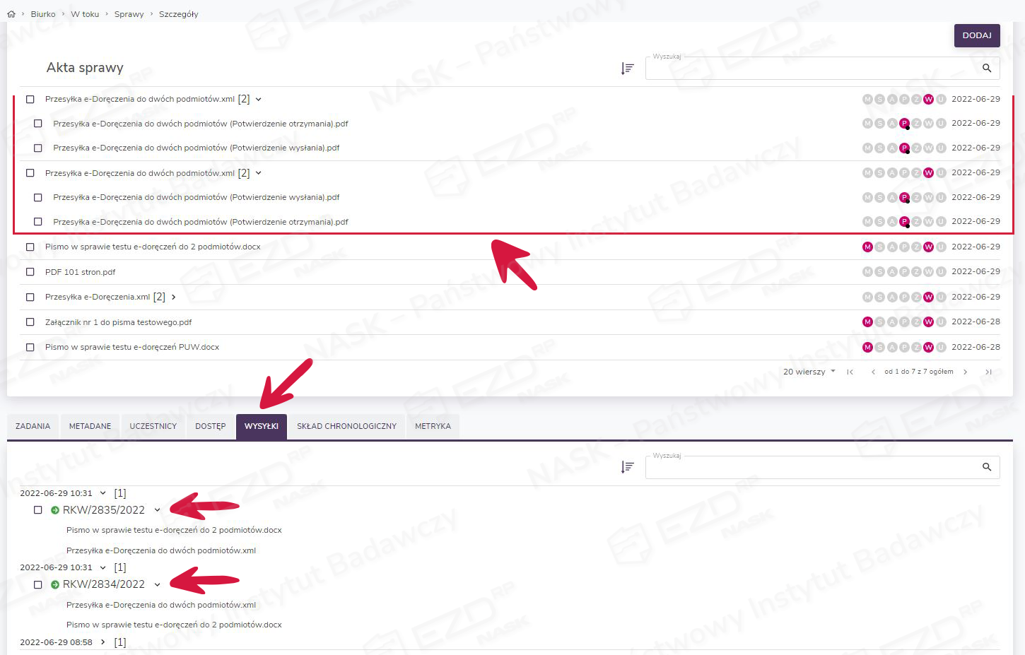 W przypadku wygenerowania jednej korespondencji do więcej niż jednego adresata w aktach sprawy pojawi się oddzielny plik XML dla każdej przesyłki i odpowiednio dołączą się pliki PDF zawierające potwierdzenia wysłania i otrzymania przesyłki. Jednocześnie w zakładce Wysyłki odkłada się informacja zawierająca kolejne numery RKW dla każdego podmiotu.