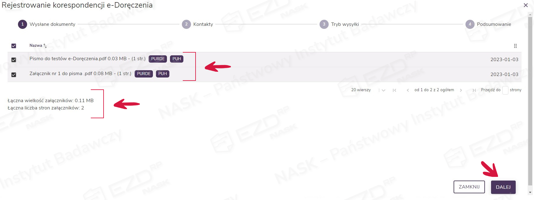 W kolejnym oknie Rejestrowanie korespondencji e-Doręczenia widoczne są dokumenty wskazane do wysłania. Obok ich nazw (z prawej strony) pojawią się opcje wysyłki PURDE i PUH.