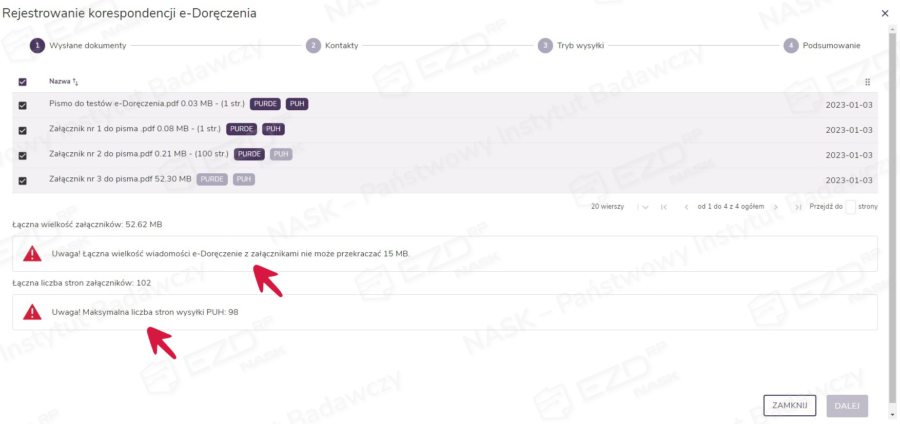 Gdy wielkość dołączonego przez użytkownika pliku lub plików przekroczy dopuszczalną wartość 15 MB lub liczbę 98 stron, system EZD RP automatycznie wyświetli stosowny komunikat. Dalsza rejestracja wysyłki w trybie e-Doręczeń nie będzie możliwa. W takiej sytuacji należy kliknąć przycisk Zamknij i dodać pliki spełniające kryteria wysyłki.