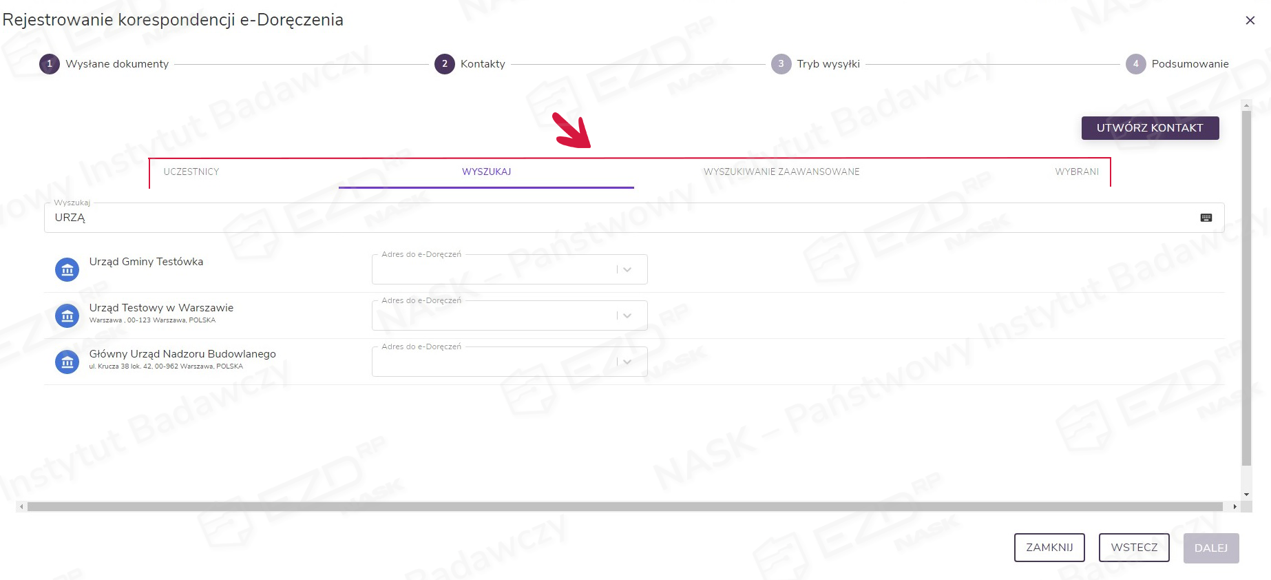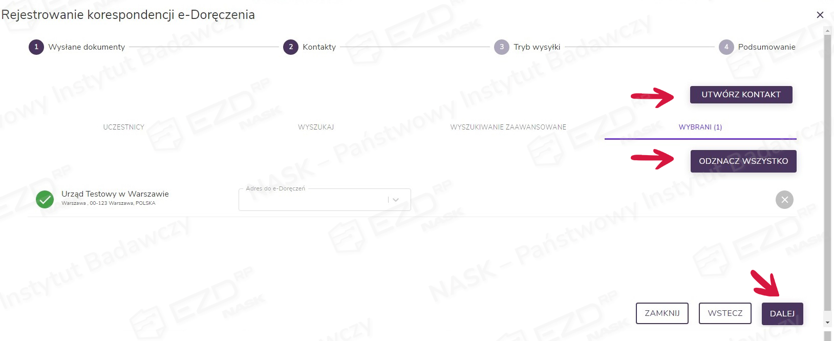 Dodatkowo na tym poziomie istnieje możliwość zmiany lub dodania adresata oraz uzupełnienia bazy kontaktów za pomocą przycisku Utwórz kontakt. Skorzystanie z przycisku Odznacz wszystko przenosi użytkownika do okna wyszukania kontaktu. Wybór kontaktu należy potwierdzić kliknięciem przycisku Dalej.