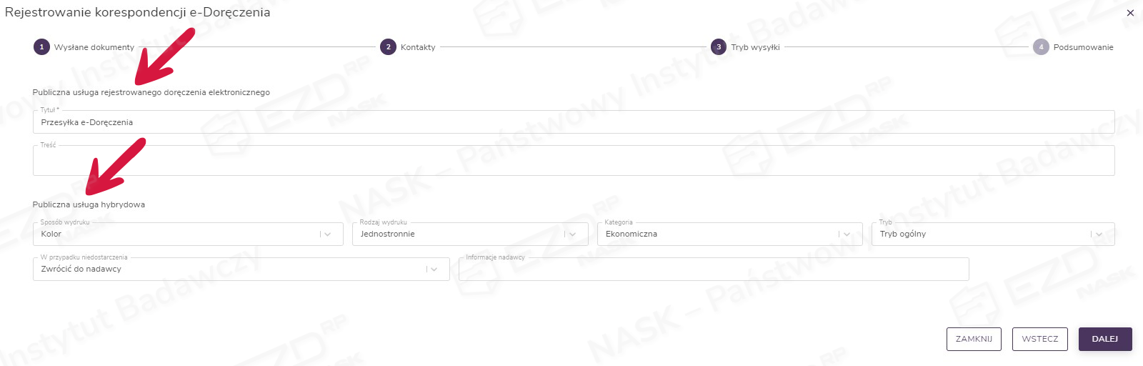 Po zatwierdzeniu wybranych kontaktów wyświetla się kolejne okno – Tryb wysyłki. W części dotyczącej PURDE należy przejść do uzupełnienia pola Treść. Pole Tytuł zostaje uzupełnione domyślnie, jednak istnieje możliwość jego zmiany. Natomiast w części dotyczącej PUH wybieramy z rozwijanych list: sposób wydruku, rodzaj wydruku, kategorię, tryb oraz postępowanie w przypadku niedostarczenia. Dodatkowo można wypełnić pole Informacje nadawcy. Po dodaniu treści i uzupełnieniu informacji klikamy przycisk Dalej.