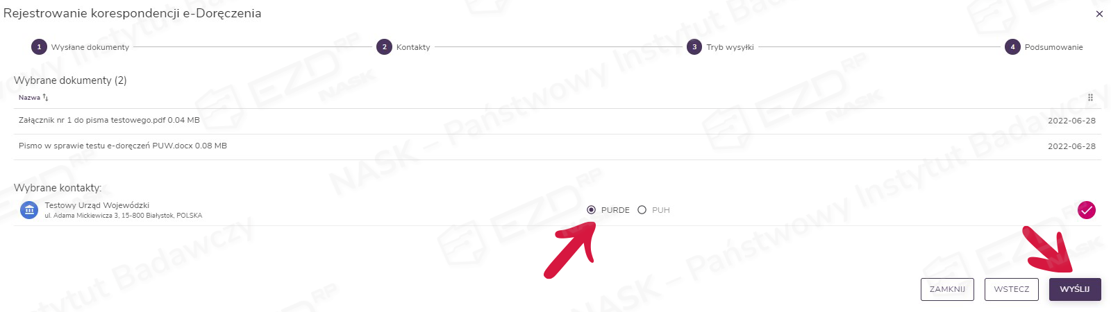 W widoku z podsumowaniem wyświetlą się dwie sekcje: Wybrane dokumenty oraz Wybrane kontakty. System automatycznie wskaże możliwy tryb wysyłki. Jeżeli pliki w przesyłce spełniają wymagania e-Doręczenia zarówno w trybie PURDE, jak i PUH, należy wskazać właściwy tryb wysyłki korespondencji i potwierdzić wybór, klikając przycisk Wyślij.