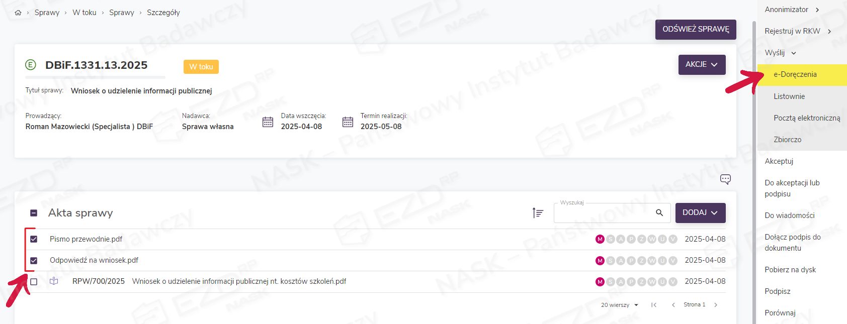 W systemie EZD RP czynność wysyłania korespondencji poprzez e-Doręczenia rozpoczynamy z poziomu akt sprawy (Sprawy > W toku > Sprawy > Szczegóły). Należy zaznaczyć pola wyboru przy dokumentach, które podlegają wysyłce. Następnie w menu kontekstowym widocznym w prawej części ekranu klikamy opcję Wyślij. Wyświetlona zostanie lista, na której dostępne są różne sposoby wysyłki. Należy z niej wybrać pozycję e-Doręczenia.