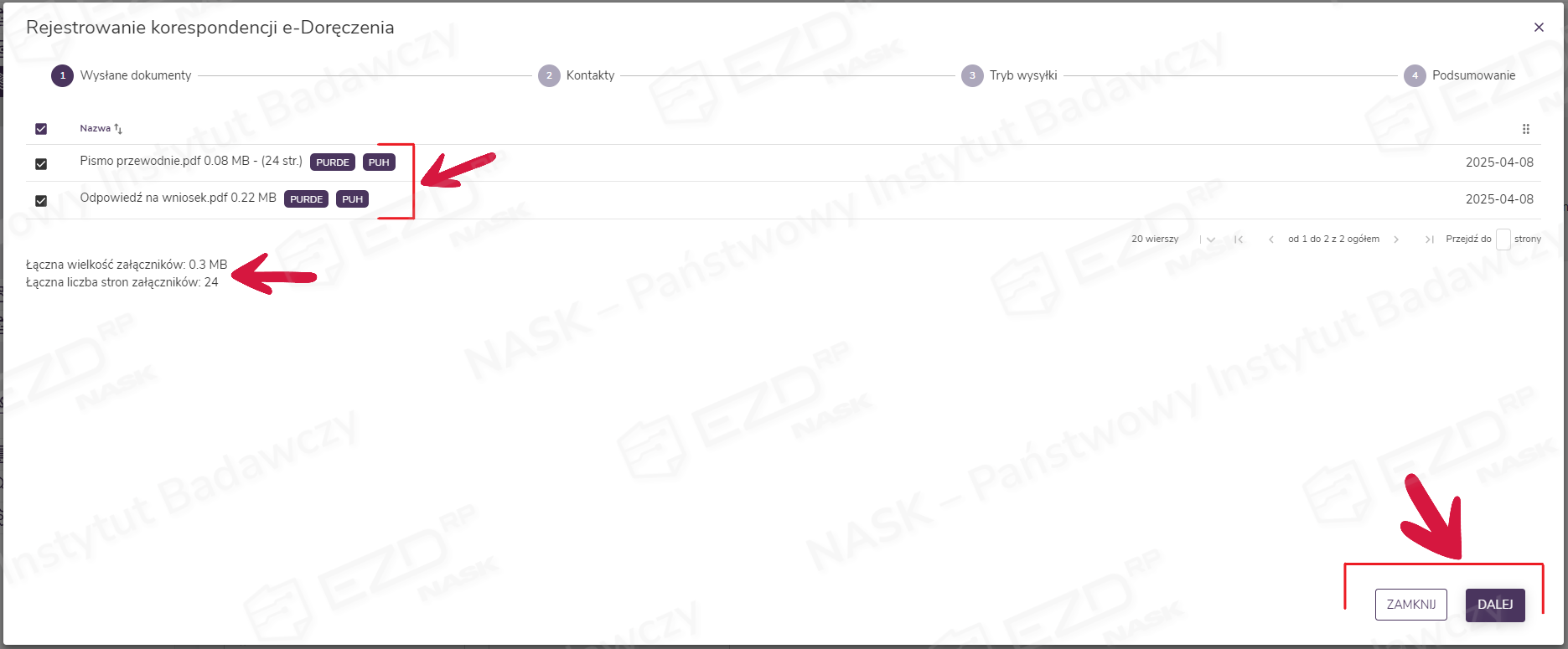 W kolejnym oknie Rejestrowanie korespondencji e-Doręczenia widoczne są dokumenty wskazane do wysłania. Obok ich nazw (z prawej strony) pojawią się opcje wysyłki PURDE i PUH.