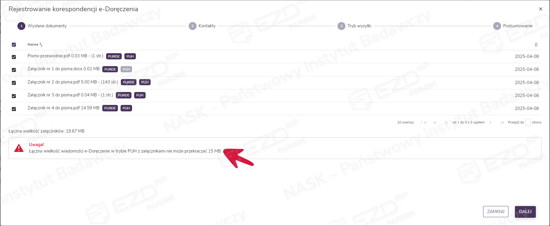 Gdy wielkość dołączonego przez użytkownika pliku lub plików przekroczy dopuszczalną wartość 500 MB dla trybu PURDE lub 15 MB dla trybu PUH oraz gdy liczba kartek plików PDF przekroczy 98, system EZD RP automatycznie wyświetli stosowny komunikat. Jeśli jeden z trybów będzie dostępny, dalsza rejestracja wysyłki poprzez e-Doręczenia będzie możliwa. Natomiast jeśli oba tryby są niedostępne, należy kliknąć przycisk Zamknij i dodać pliki spełniające kryteria wysyłki.