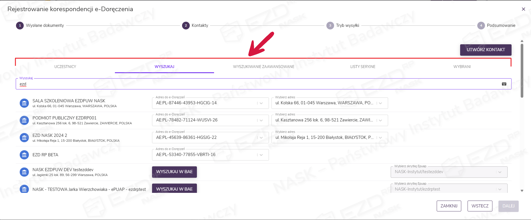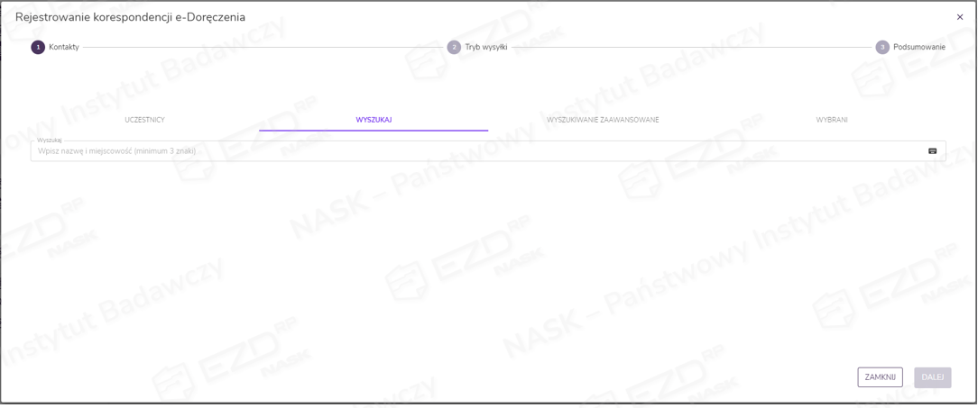 Po dodaniu dokumentów i kliknięciu przycisku Dalej przechodzimy do wyboru odbiorcy korespondencji. Dostępne są trzy opcje wyszukania kontaktu: wskazanie go z zakładki Uczestnicy, użycie wyszukiwarki lub skorzystanie z wyszukiwania zaawansowanego. Wskazanie kontaktu spowoduje przeniesienie go do zakładki Wybrani.