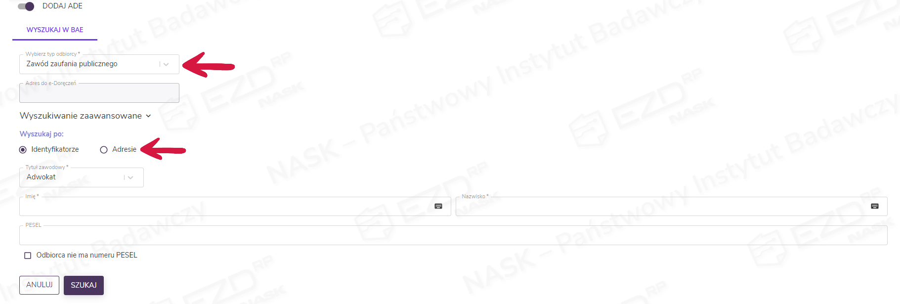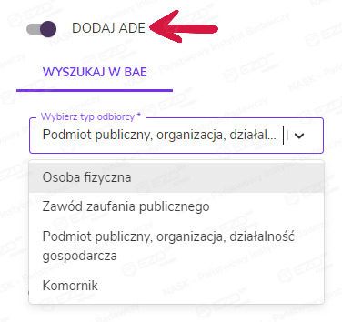 Po kliknięciu przycisku Utwórz kontakt istnieje możliwość dodania podmiotu lub instytucji, a także osoby fizycznej. Wśród dostępnych funkcji jest Dodaj ADE. Po uruchomieniu jej za pomocą suwaka wyświetli się możliwość dodania adresu doręczeń elektronicznych (ADE) poprzez opcję Wyszukaj w BAE. Wyszukiwanie odbywa się według typu odbiorcy w Bazie Adresów Elektronicznych. Aby odnaleźć adresata, należy wpisać adres doręczeń elektronicznych lub skorzystać z Wyszukiwania zaawansowanego, podając właściwy dla danego typu identyfikator lub adres.