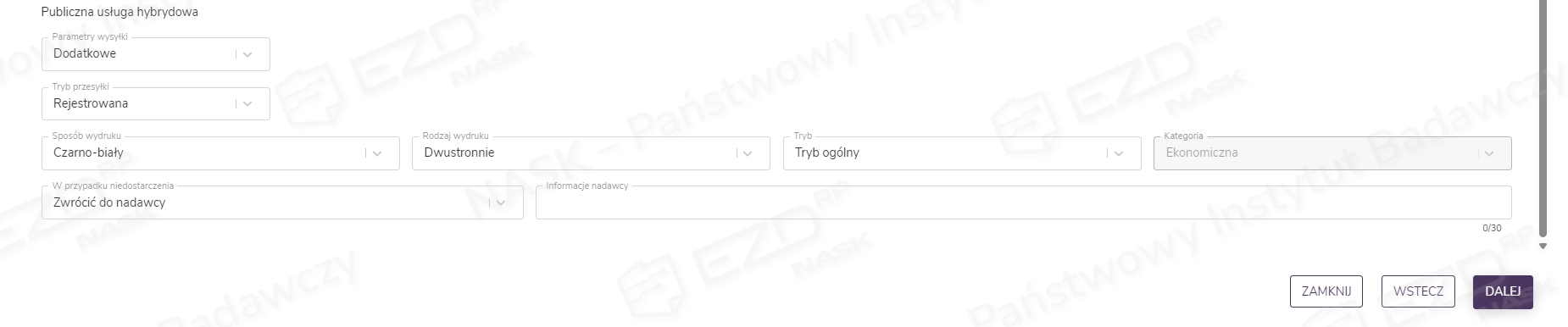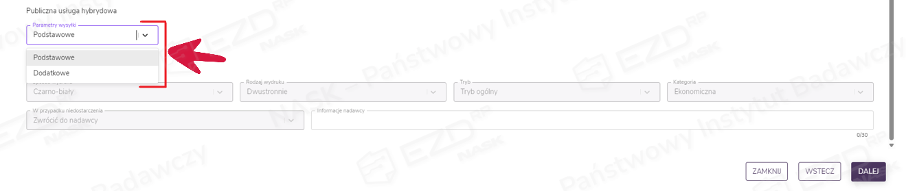 Natomiast w części dotyczącej PUH w pierwszej kolejności wybieramy z rozwijanej listy parametry wydruku – podstawowe lub dodatkowe. W zależności od wyboru niżej będą dostępne do edycji lub zablokowane odpowiednie opcje: Tryb przesyłki, Sposób wydruku, Rodzaj wydruku, Kategoria, Tryb oraz postępowanie w przypadku niedostarczenia. Dodatkowo można wypełnić pole Informacje nadawcy, którego treść zostanie wydrukowana na kopercie. Po dodaniu treści i uzupełnieniu informacji klikamy przycisk Dalej.