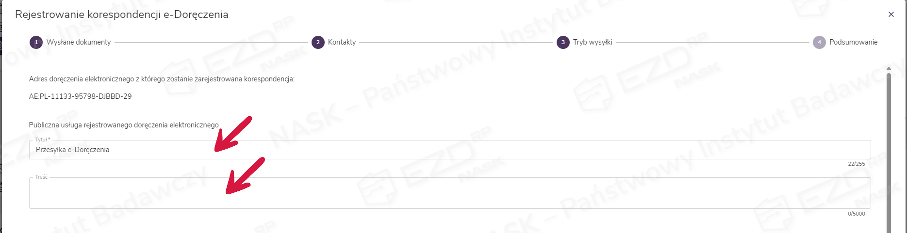 W części dotyczącej trybu PURDE znajdują się pola do uzupełnienia – Tytuł oraz Treść. Pole Tytuł zostaje uzupełnione domyślnie, jednak istnieje możliwość zmiany jego zawartości.