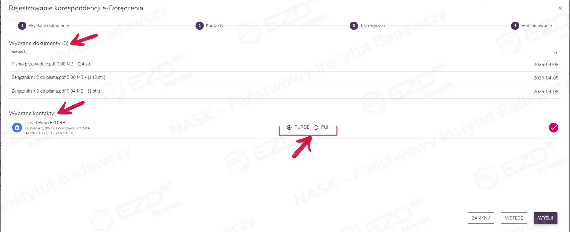 W widoku z podsumowaniem wyświetlą się dwie sekcje: Wybrane dokumenty oraz Wybrane kontakty. System automatycznie wskaże możliwy tryb wysyłki. Jeżeli pliki w przesyłce spełniają wymagania e-Doręczenia zarówno w trybie PURDE, jak i PUH, należy wskazać właściwy tryb wysyłki korespondencji i potwierdzić wybór, klikając przycisk Wyślij.