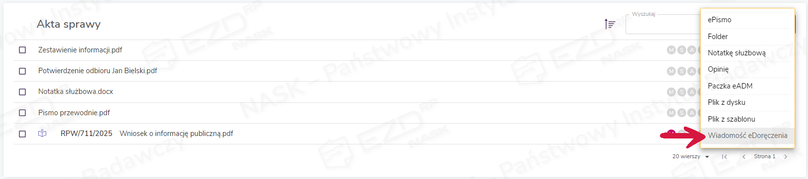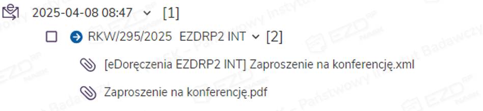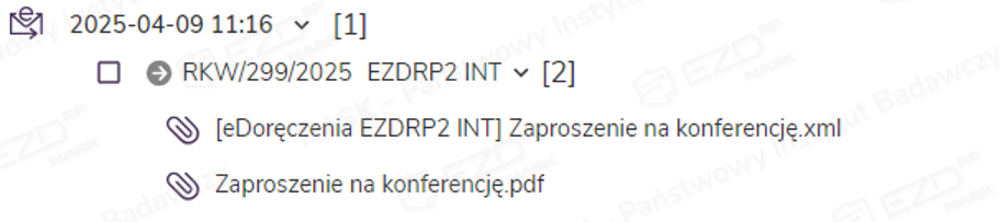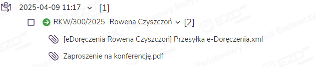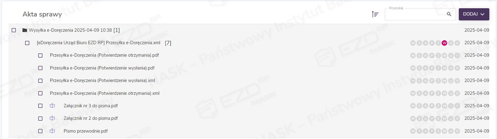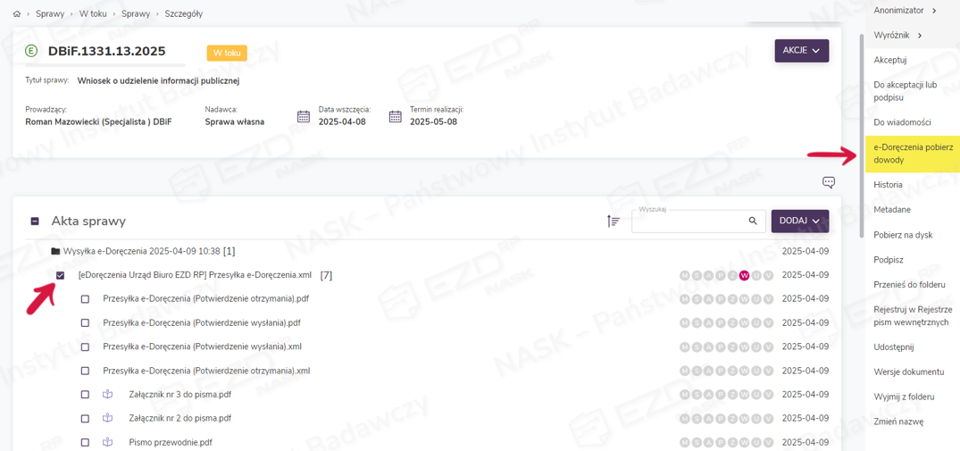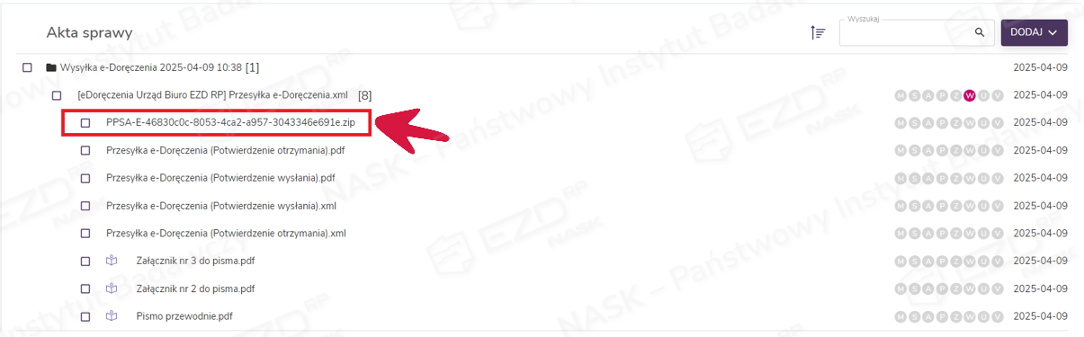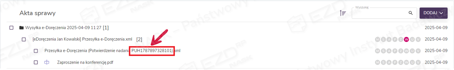 W aktach sprawy tworzy się folder zawierający wysyłki wygenerowane podczas danej rejestracji. Zawiera on plik w formacie XML o wcześniej wpisanym w oknie rejestracji korespondencji tytule (tutaj: Przesyłka e-Doręczenia) oraz wskazane do wysyłki załączniki. W tym miejscu dołączone zostaną także dowody potwierdzające realizację kolejnych etapów procesu wysyłki dostarczone przez Operatora Wyznaczonego (czyli Pocztę Polską). W przypadku przesyłek PURDE będzie to Potwierdzenie wysłania oraz Potwierdzenie otrzymania, a w przypadku przesyłek PUH – Potwierdzenie nadania, EPO (Elektroniczne Potwierdzenie Odbioru) lub Dowód walidacji (w razie odrzucenia przesyłki przez operatora.