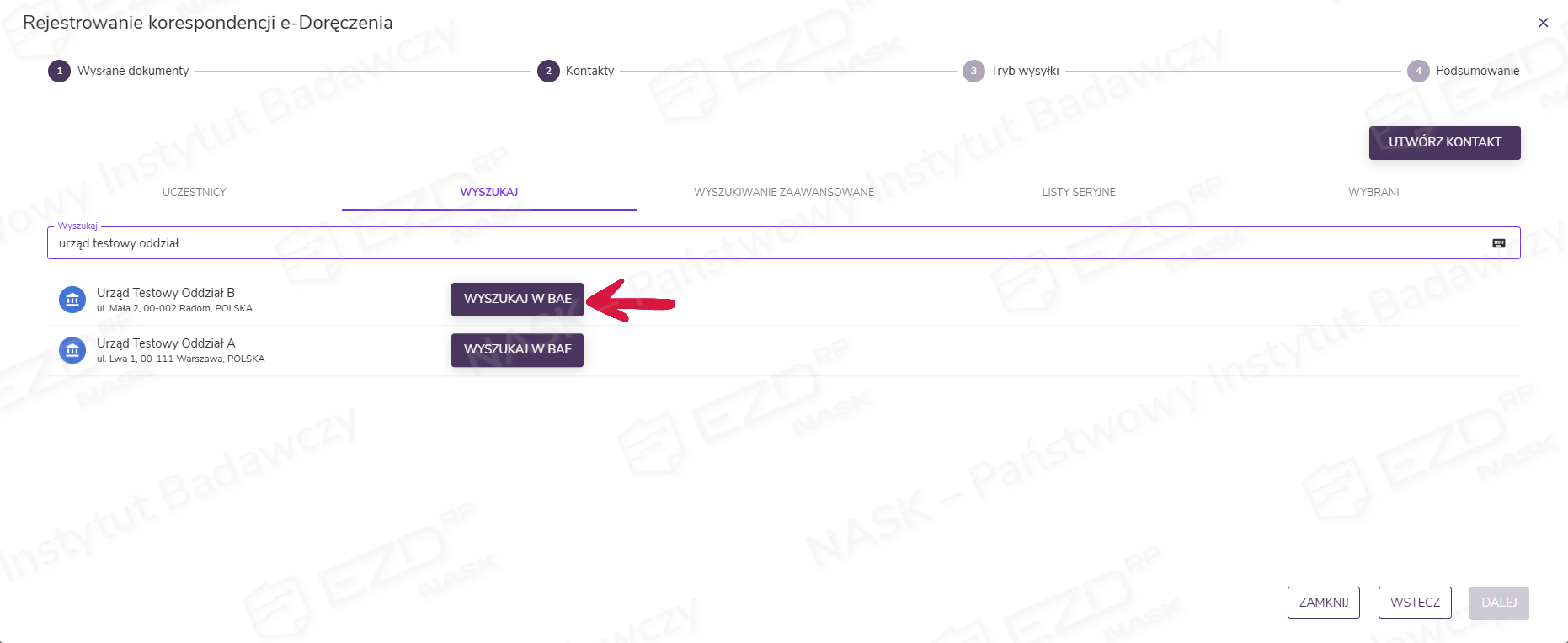 Dodatkowo na tym poziomie istnieje możliwość zmiany lub dodania adresata oraz uzupełnienia bazy kontaktów za pomocą przycisku Utwórz kontakt (wymagane jest uprawnienie do edycji bazy kontaktów). Skorzystanie z przycisku Odznacz wszystko przenosi użytkownika do okna wyszukania kontaktu. Wybór kontaktu należy potwierdzić kliknięciem przycisku Dalej.