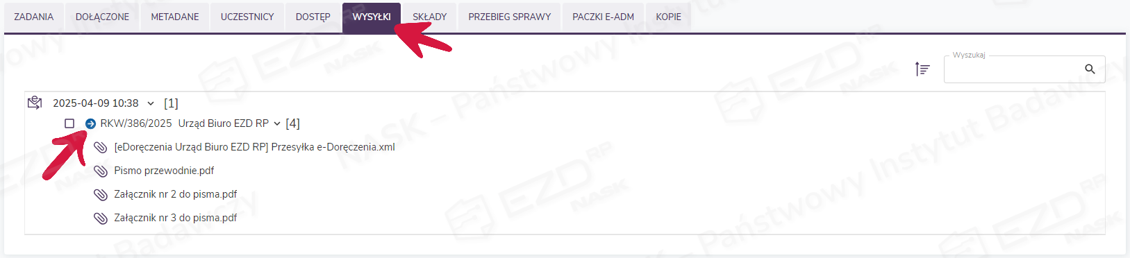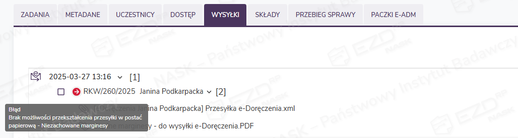 W przypadku wygenerowania jednej korespondencji do więcej niż jednego adresata w aktach sprawy pojawi się oddzielny plik XML dla każdej przesyłki i odpowiednio dołączą się pliki PDF zawierające potwierdzenia wysłania i otrzymania przesyłki. Jednocześnie w zakładce Wysyłki odkłada się informacja zawierająca kolejne numery RKW dla każdego podmiotu.