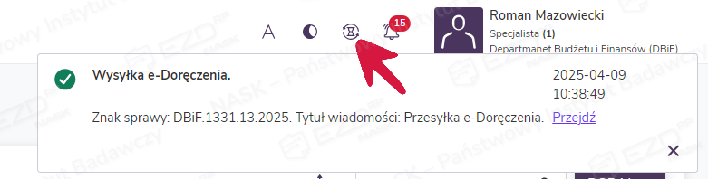Okno rejestrowania korespondencji e-Doręczeń zostanie zamknięte, a wysyłka zlecona do realizacji. Potwierdzenie wykonania prawidłowego zlecenia zostanie wyświetlone z poziomu Akcji w tle.