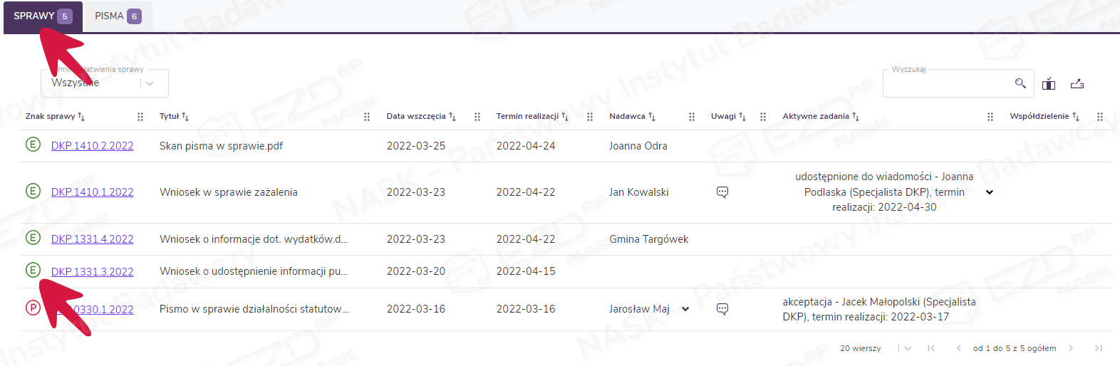 System EZD RP umożliwia wysyłkę wiadomości e-mail bezpośrednio z poziomu prowadzonej sprawy. W tym celu należy ze strony głównej przejść do sekcji Biurko > W toku > Sprawy, a następnie wybrać sprawę, dla której chcemy wysłać korespondencję e-mail.