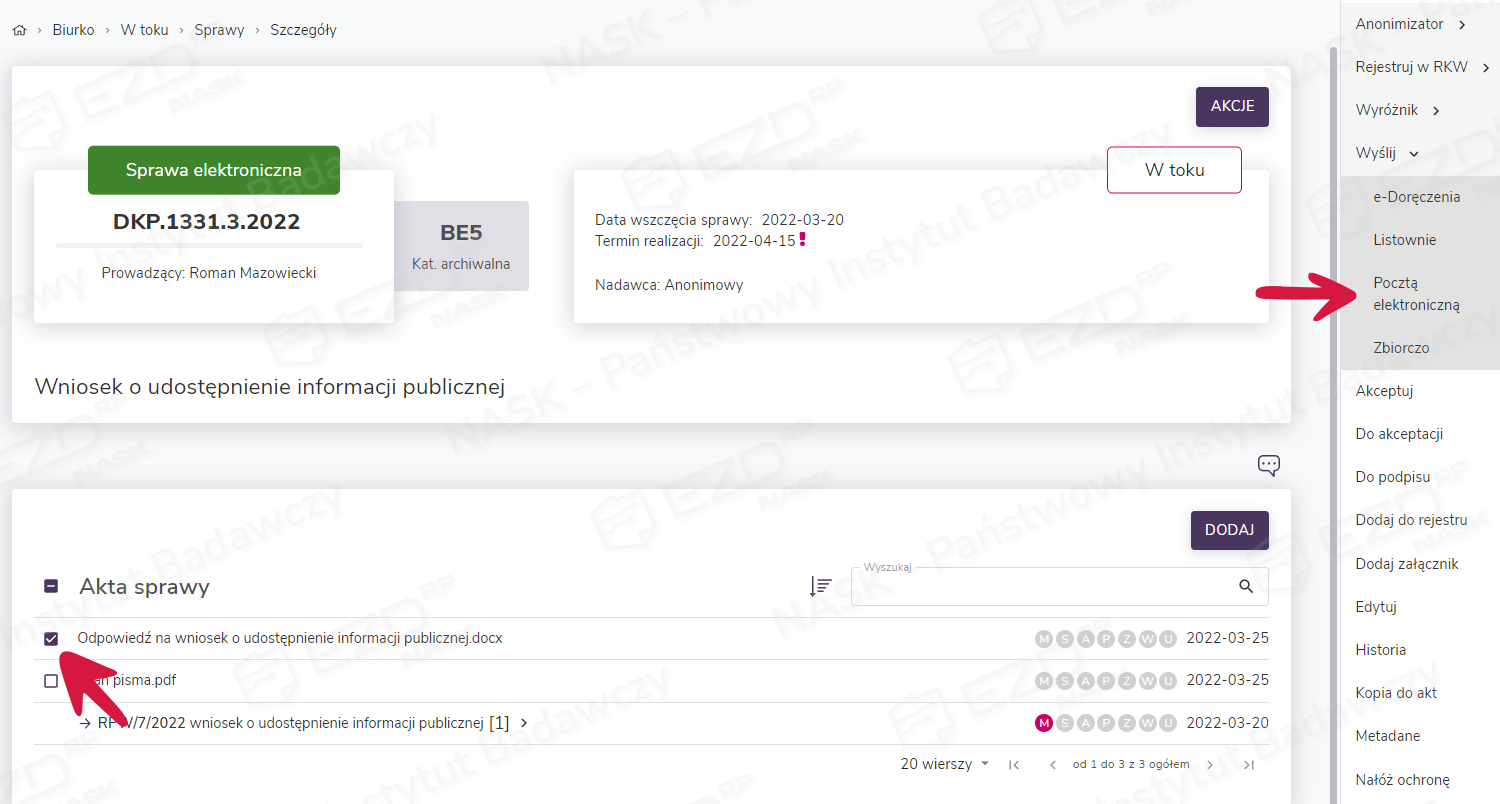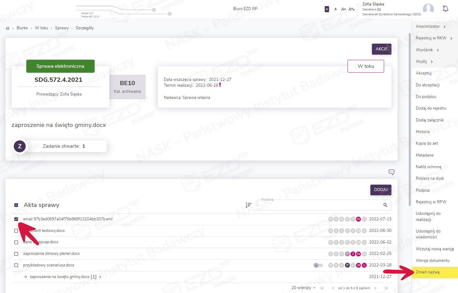 Po wysłaniu wiadomości zostanie ona automatycznie dodana do akt sprawy. Kliknięcie jej nazwy spowoduje pobranie pliku z rozszerzeniem .eml, który można odczytać przy użyciu programu pocztowego. Można też zmienić nazwę wiadomości, zaznaczając pole wyboru przy dotychczasowej nazwie i wybierając w prawym menu funkcję Zmień nazwę.