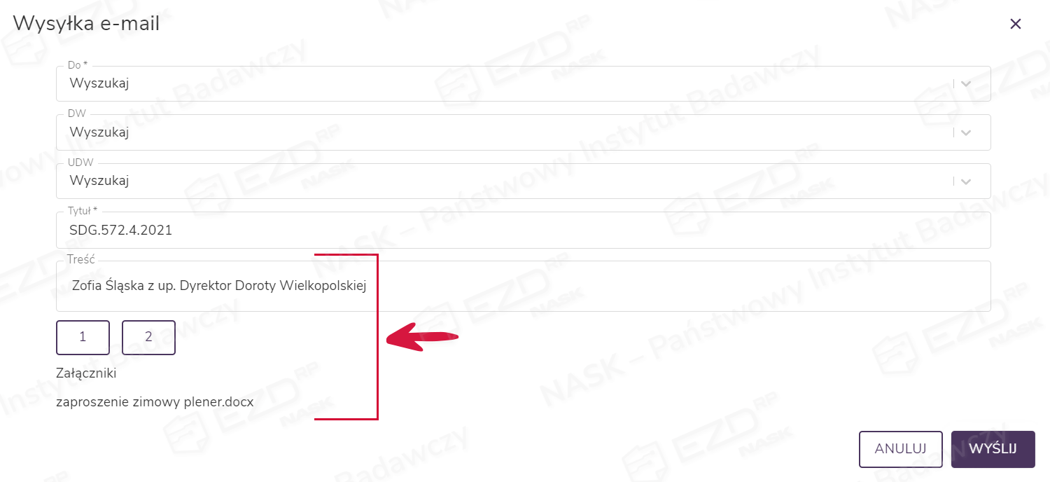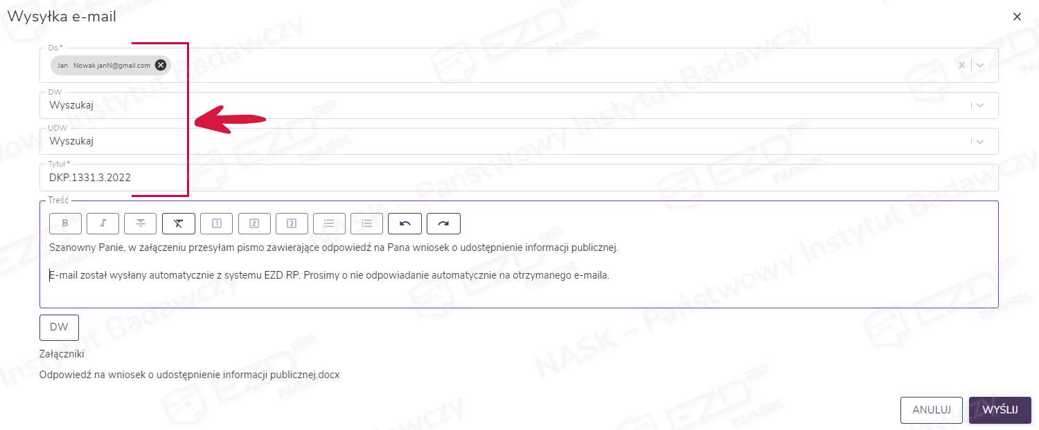 System przeniesie nas do widoku Wysyłka e-mail. Należy wypełnić wszystkie pola obowiązkowe: