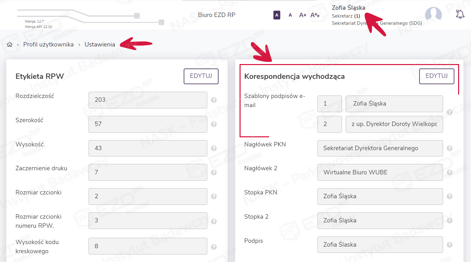 Po wybraniu szablonu podpisu e-mail w pole Treść zostanie wstawiony tekst, który został stworzony podczas konfiguracji szablonu. Szablony konfiguruje się, wchodząc w menu górnym w Profil użytkownika > Ustawienia i klikając przycisk Edytuj w sekcji Korespondencja wychodząca.