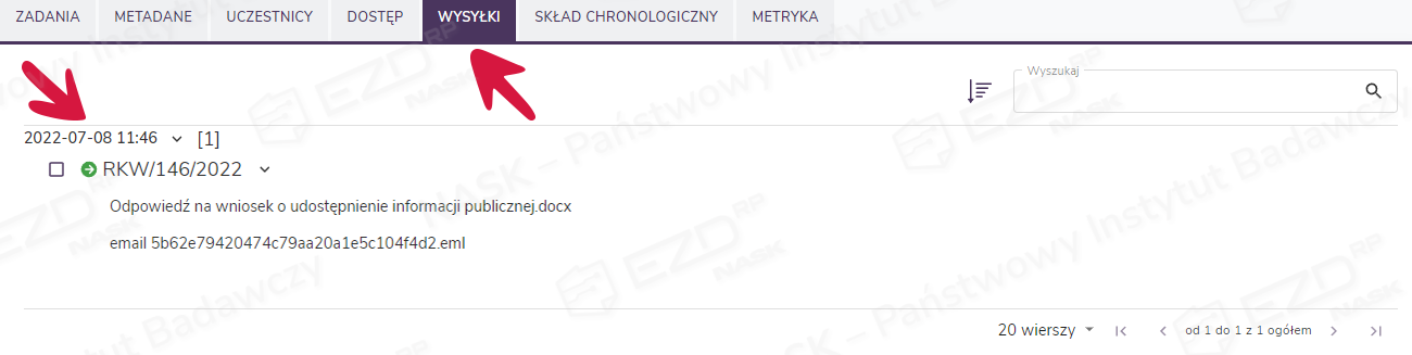 Wygenerowana korespondencja znajdzie się w widoku sprawy w zakładce Wysyłki. Po kliknięciu zakładki, a następnie symbolu rozwijania przy dacie wysyłki wyświetli się nadany numer RKW (rejestr korespondencji wychodzącej).