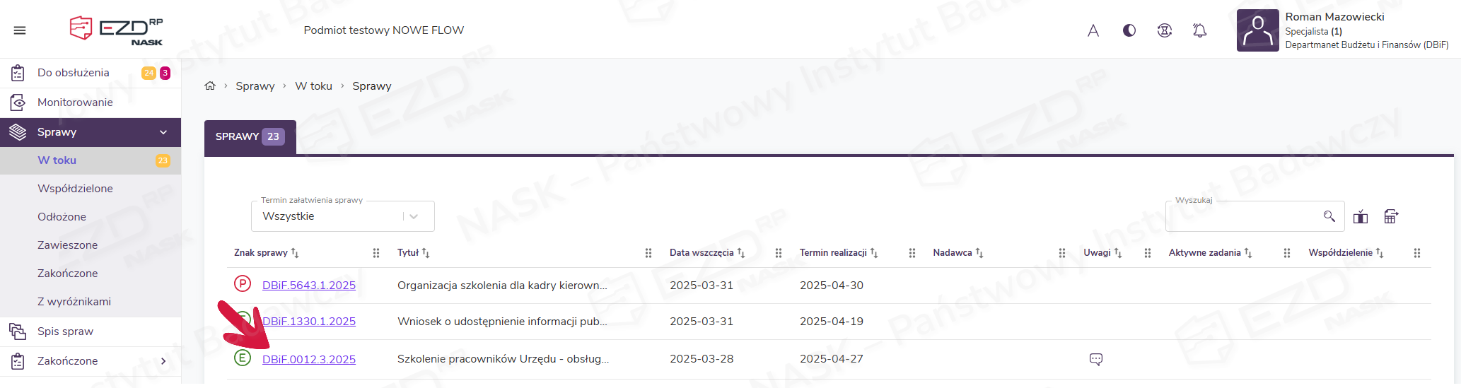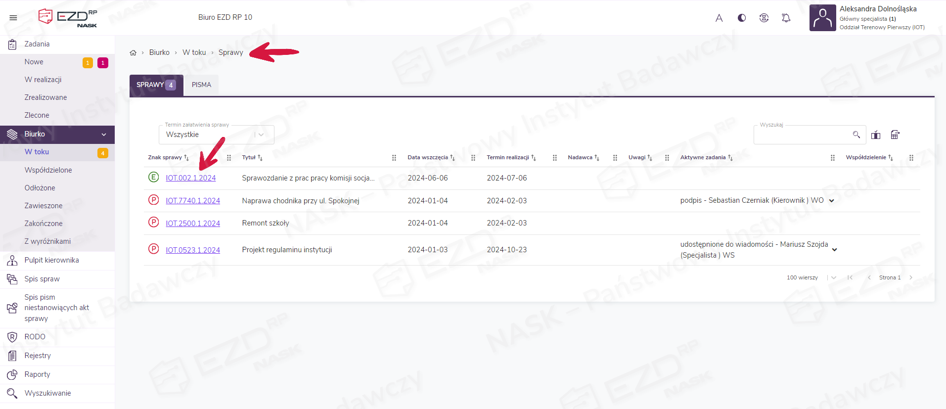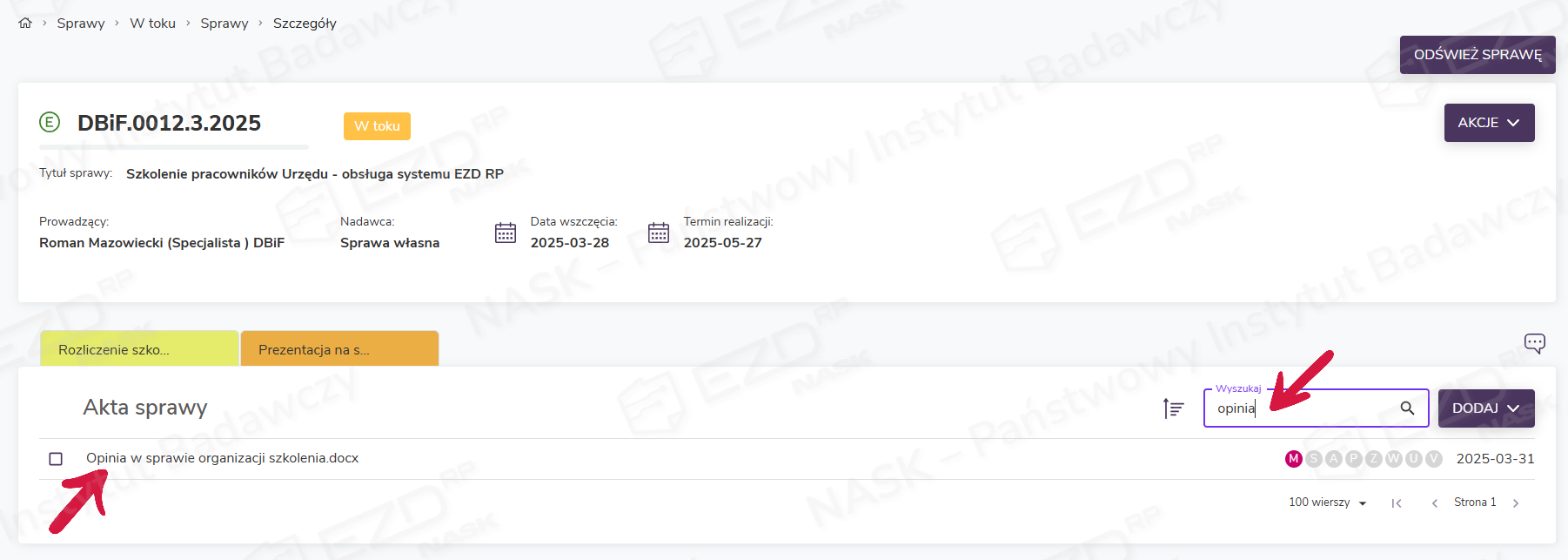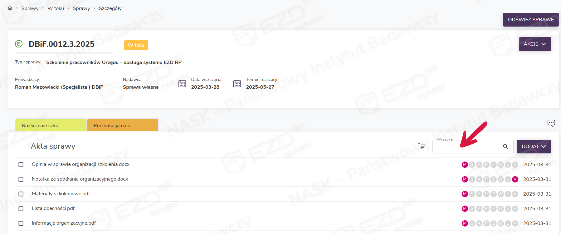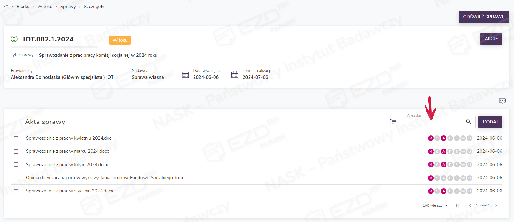 W celu wyszukania akt w obrębie prowadzonej sprawy należy otworzyć widok Sprawy > W toku > Sprawy. W zakładce wyświetlona zostanie lista spraw prowadzonych przez danego użytkownika. Następnie trzeba kliknąć podlinkowany znak sprawy i przejść do widoku jej szczegółów.