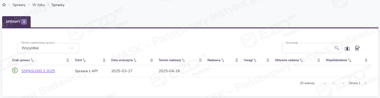 W wyniku wywołania sprawa zostaje zarejestrowana w systemie i będzie widoczna w zakładce Sprawy.