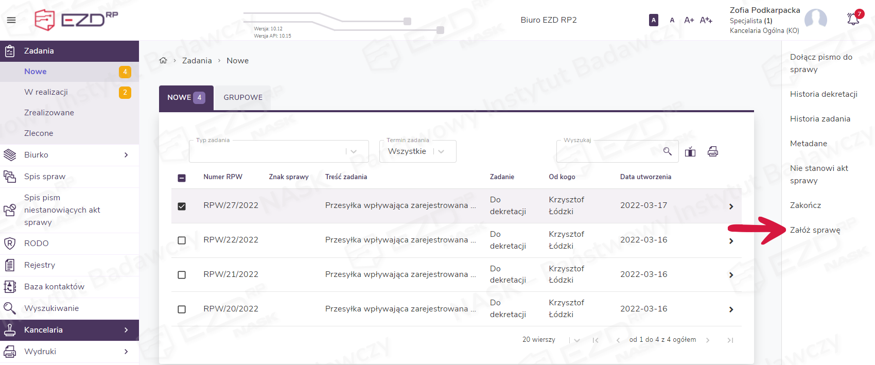 Aby założyć sprawę na dokumencie, który został zarejestrowany w RPW (rejestr przesyłek wpływających) i przypisany pracownikowi, należy przejść do widoku Zadania > Nowe. Z listy wybieramy przesyłkę, na podstawie której chcemy założyć sprawę. Po zaznaczeniu pola wyboru z prawej strony menu wyświetli się menu kontekstowe, gdzie należy kliknąć Załóż sprawę.