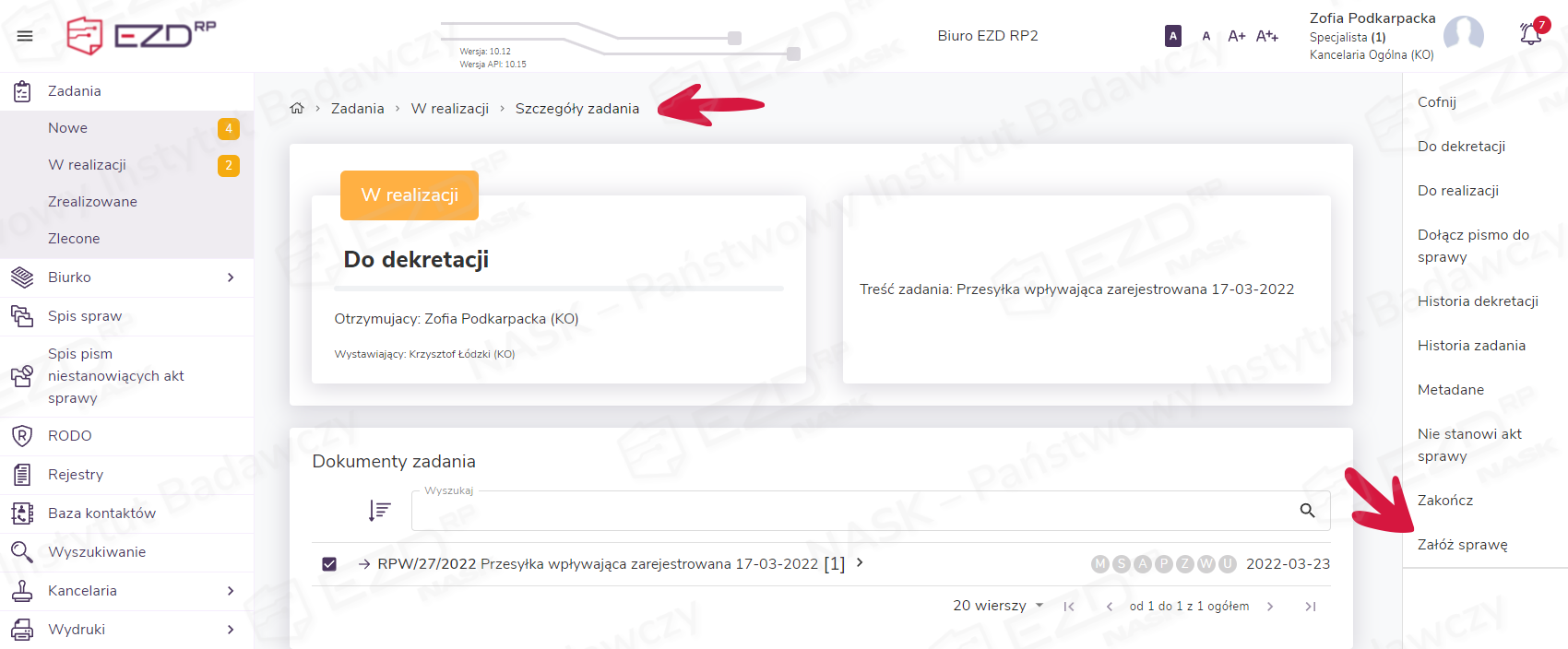 Sprawę można również założyć w widoku Zadania > W realizacji > Szczegóły zadania. Należy pamiętać, że wystarczy kliknąć w zadanie wyświetlone na liście w sekcji Zadania > Nowe, aby automatycznie zostało ono przeniesione do sekcji Zadania > W realizacji.