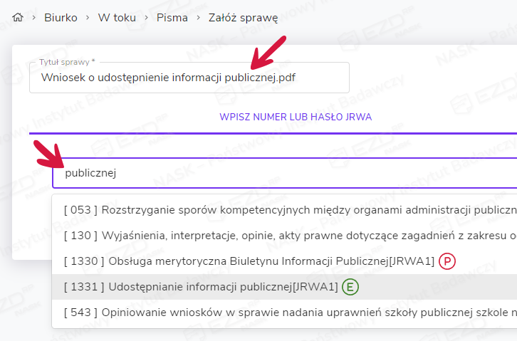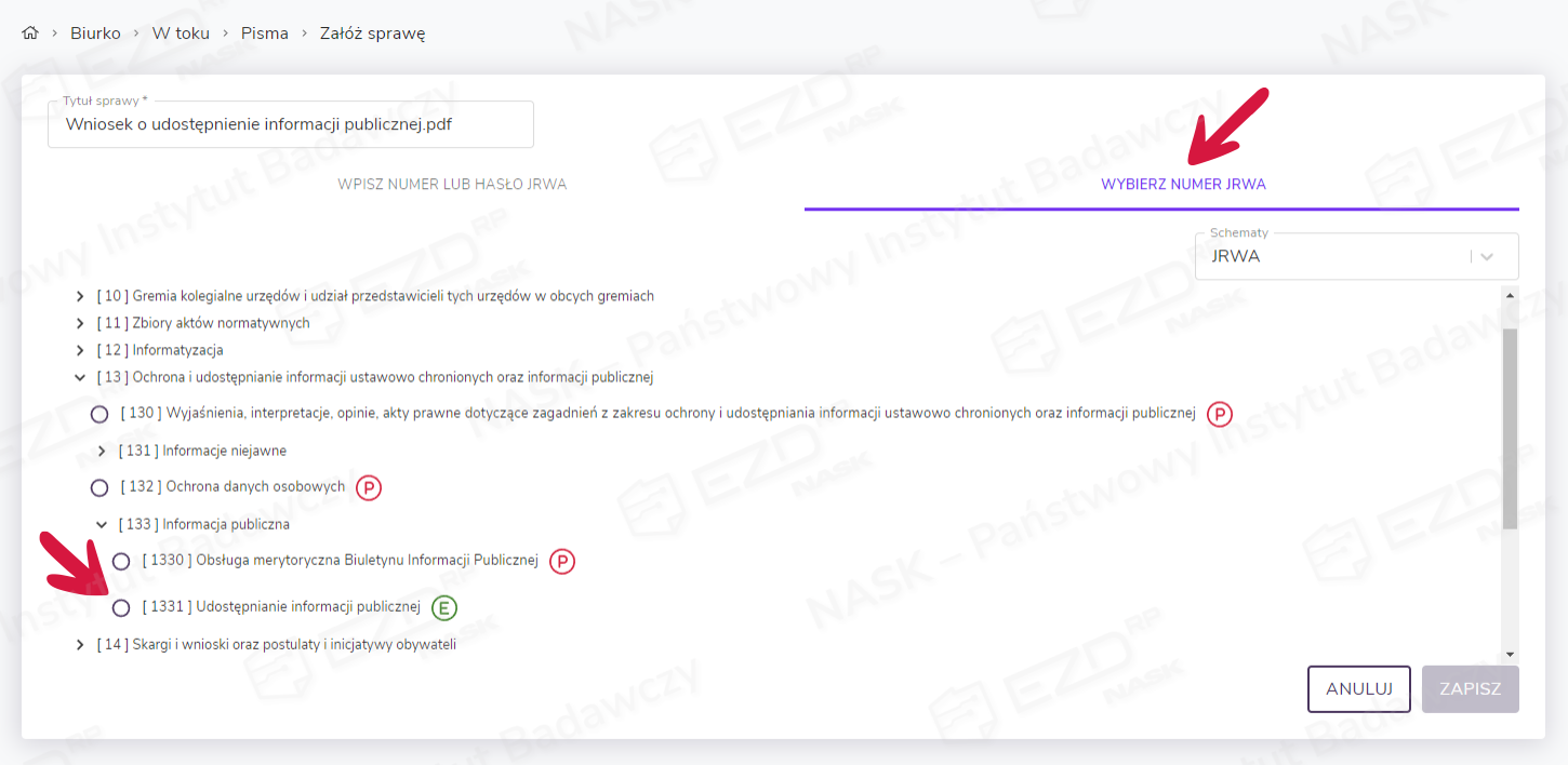 Wybór klasy JRWA informuje o sposobie prowadzenia sprawy: papierowo (czerwona ikona z literą P w okręgu) lub elektronicznie (zielona ikona z literą E). Decydują o tym przepisy prawa oraz dana instytucja.