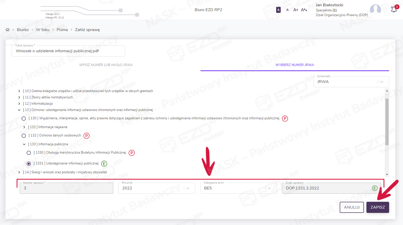 Po wybraniu odpowiednej klasy JRWA system informuje, jaki zostanie nadany numer sprawy. Dzięki walidacji automatycznie jest wskazywany kolejny dostępny numer, jednak można go też wprowadzić samodzielnie (więcej informacji w artykule Samodzielne nadawanie numeru sprawie).