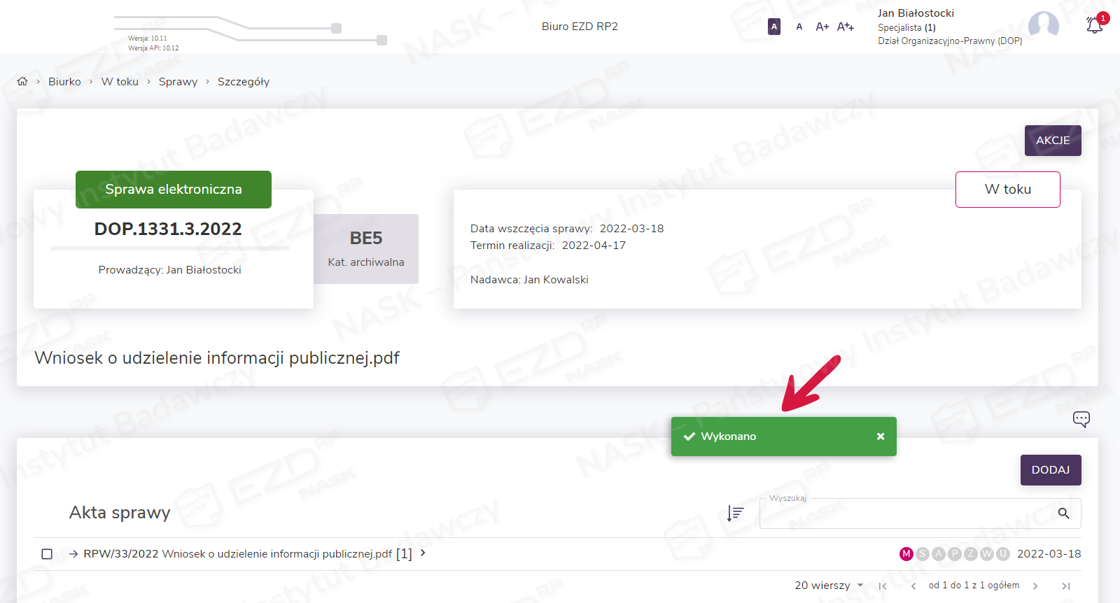 Po zapisaniu system przenosi użytkownika do widoku szczegółów założonej sprawy oraz informuje o wykonaniu czynności, wyświetlając stosowny komunikat .