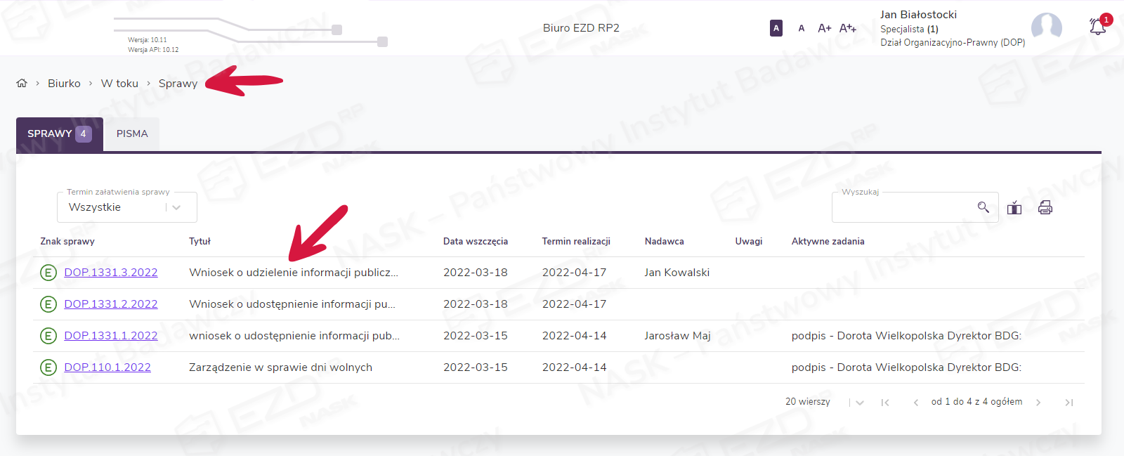 Poprawnie zarejestrowana sprawa znajdzie się w widoku Biurko > W toku > Sprawy oraz w spisie spraw dla danej instancji.