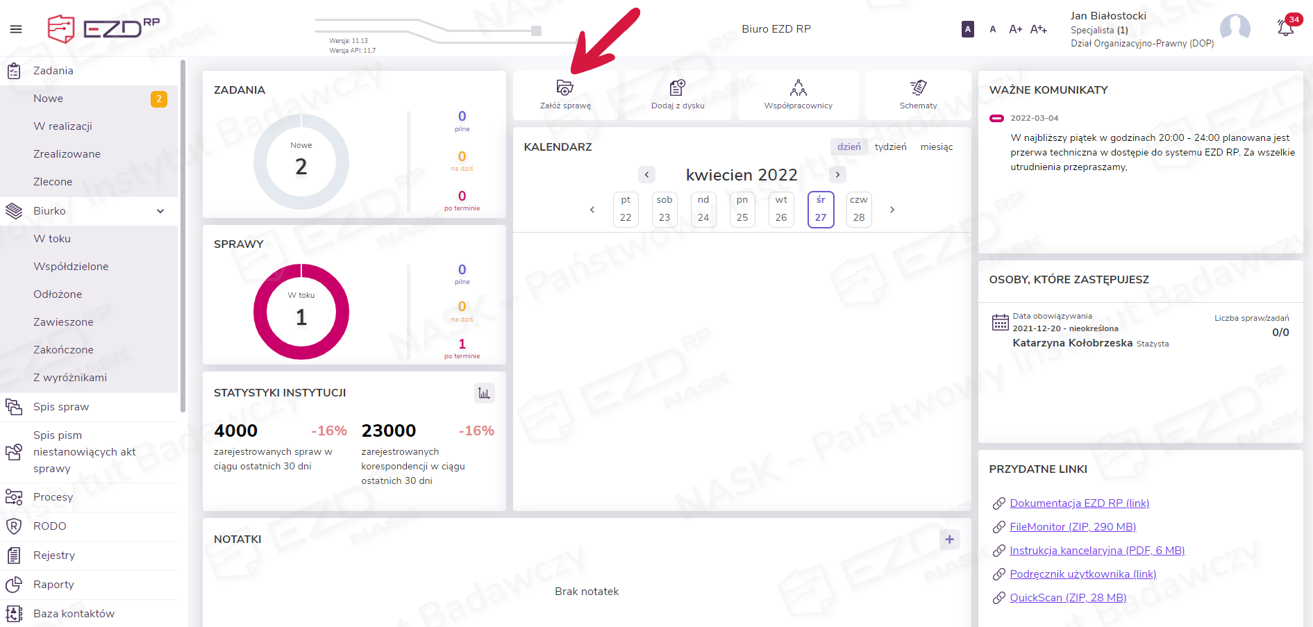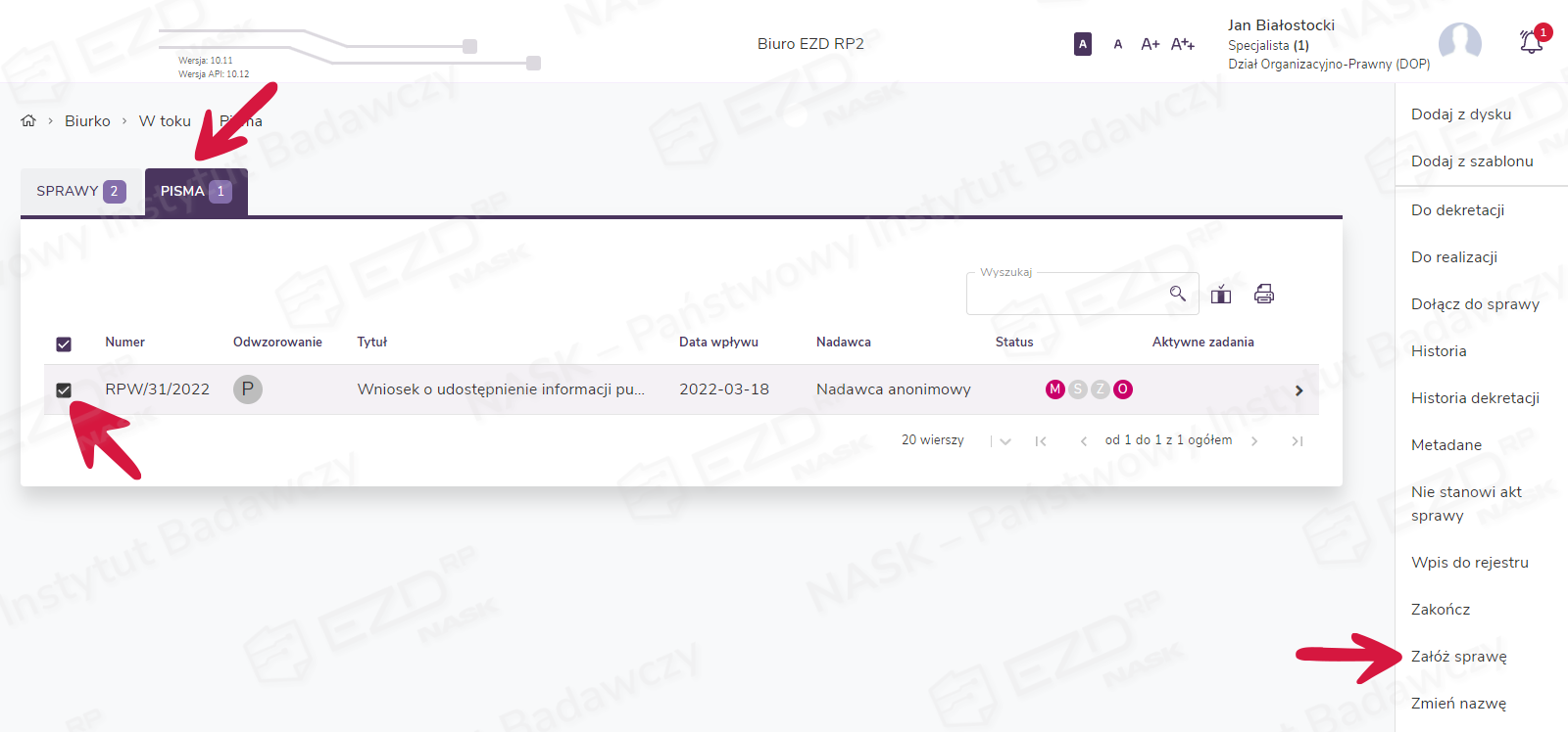 Zakładanie sprawy z poziomu pisma