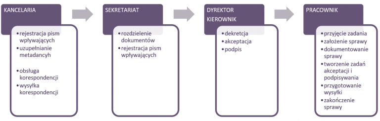 Czynności realizowane w ramach zadań są wykonywane przez przydzielonych do nich użytkowników, a widoczne w systemie statusy ułatwiają zarówno pracownikom jak i ich przełożonym monitorowanie stopnia realizacji zadania (np. oczekujące, zrealizowane).