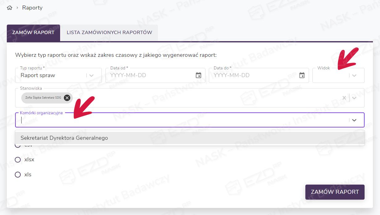 Po wybraniu typu raportu osoba zamawiająca może wskazać stanowisko (pracownika), dla którego generowany jest raport, lub komórkę organizacyjną. Konieczne jest też wskazanie zakresu czasowego, którego ma dotyczyć zestawienie danych, oraz formatu pliku, w jakim dane zostaną zapisane. Raporty można zapisywać w plikach CSV, XLS i XLSX.