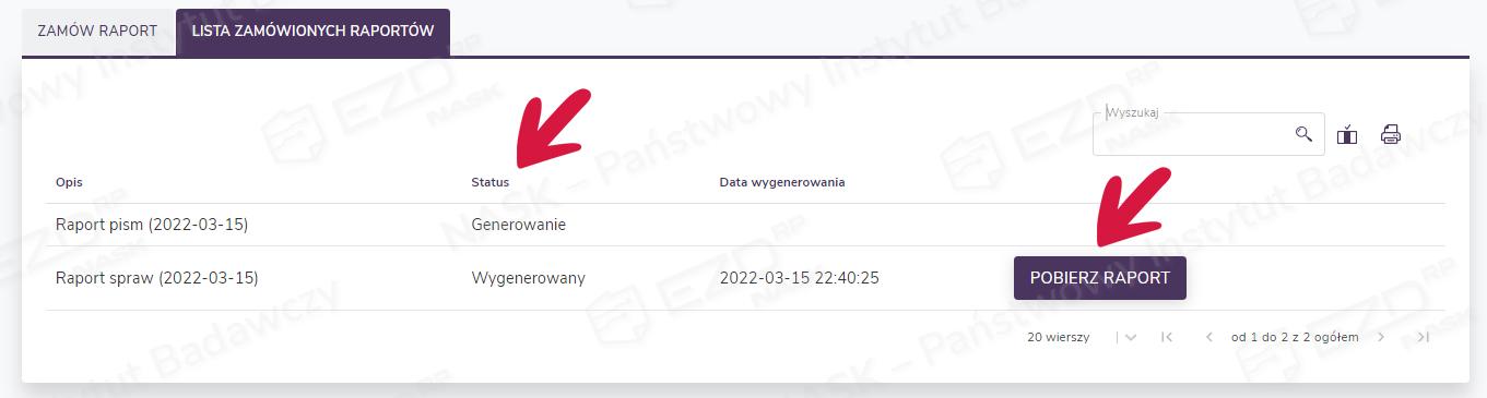 W momencie przygotowania zamówionego raportu zmieni się jego status na Wygenerowany i możliwe będzie pobranie pliku na dysku (przycisk Pobierz raport). Automatycznie zostanie też wysłana z systemu EZD RP na adres ustawiony w profilu użytkownika wiadomość e-mail z powiadomieniem o dostępności zamówionego raportu.