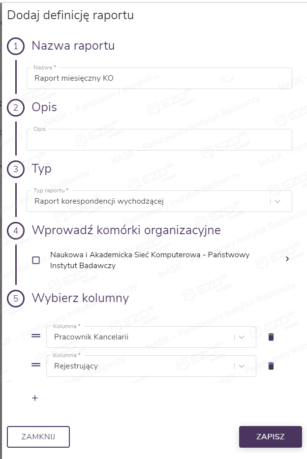 Szablony tworzone są w module Administracja > Raporty. Po kliknięciu przycisku Dodaj możliwe jest wprowadzenie nazwy szablonu raportu, jego opisu, wskazanie typu generowanego raportu, rodzaju i kolejności kolumn oraz określenie komórki organizacyjnej, której dotyczyć będą dane uwzględniane w raporcie.