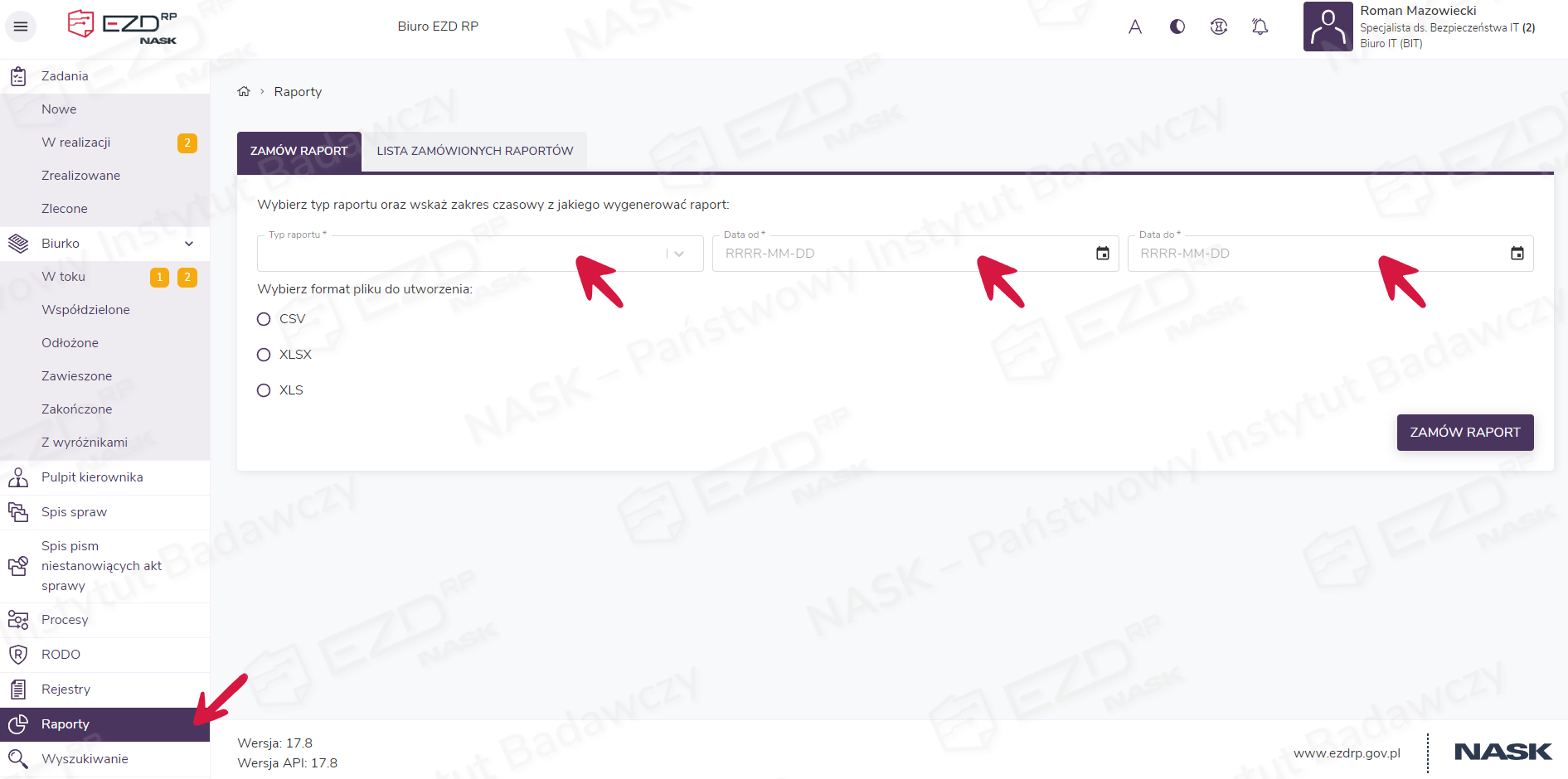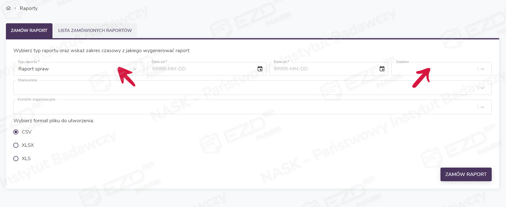 Opcje dostępne w zakładce Zamów raport pozwalają określić: typ zamawianego raportu, zakres czasowy pobieranych danych oraz format pliku, w którym zostaną one zapisane.