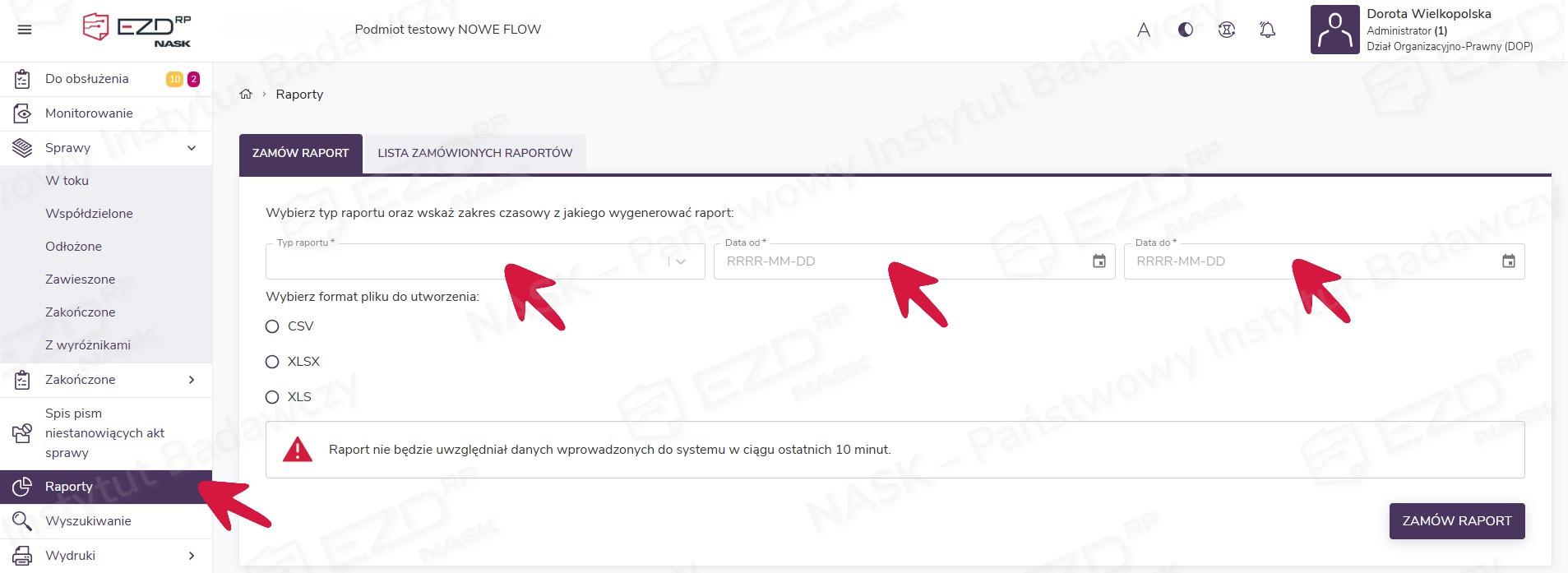 Formaty plików, w jakich mogą być generowane raporty, to CSV, XLS i XLSX. Jeśli jednak raport będzie zawierał więcej niż 50 000 rekordów, należy wybrać format CSV. Po zaznaczeniu opcji XLSX lub XLS system wyświetli informujący o ograniczeniach komunikat. Widoczna będzie również informacja o tym, że raport nie uwzględnia danych wprowadzonych do systemu w ciągu ostatnich 10 minut.
