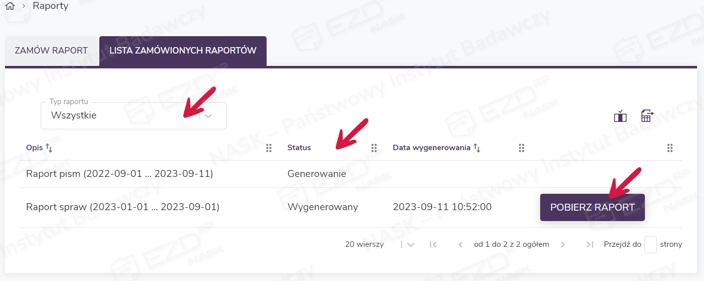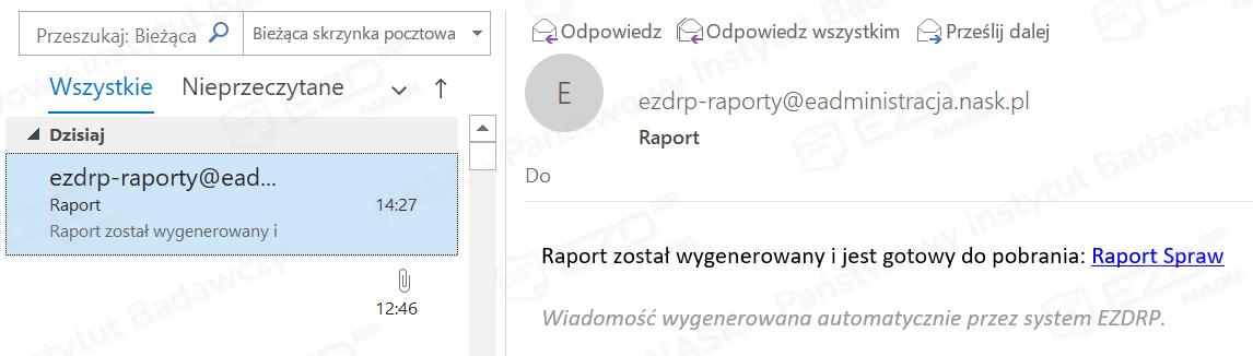 W momencie przygotowania zamówionego raportu jego status zmieni się na Wygenerowany i możliwe będzie pobranie pliku na dysk (przycisk Pobierz raport). Automatycznie zostanie też wysłana z systemu EZD RP na adres ustawiony w profilu użytkownika wiadomość e-mail z powiadomieniem o dostępności zamówionego raportu.
