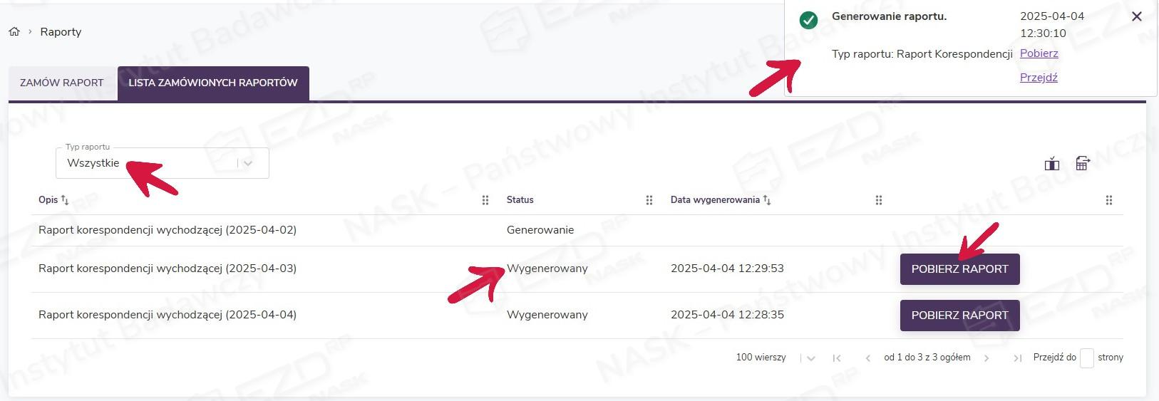 W momencie przygotowania zamówionego raportu jego status zmieni się na Wygenerowany i możliwe będzie pobranie pliku na dysk (przycisk Pobierz raport). Pojawi się również okno z informacją o poprawnym wygenerowaniu raportu w Akcjach w tle. Automatycznie zostanie też wysłana z systemu EZD RP na adres ustawiony w profilu użytkownika wiadomość e-mail z powiadomieniem o dostępności zamówionego raportu.