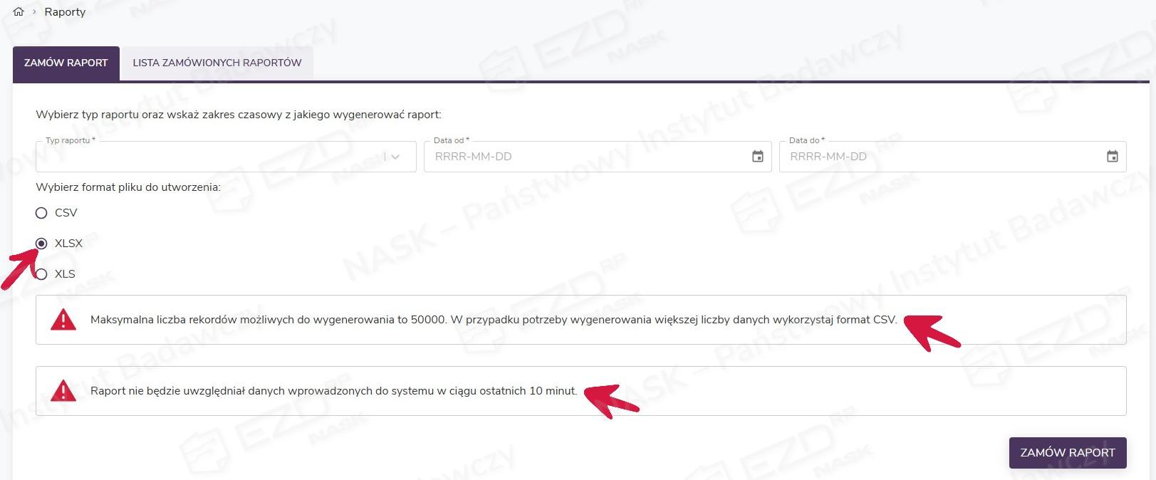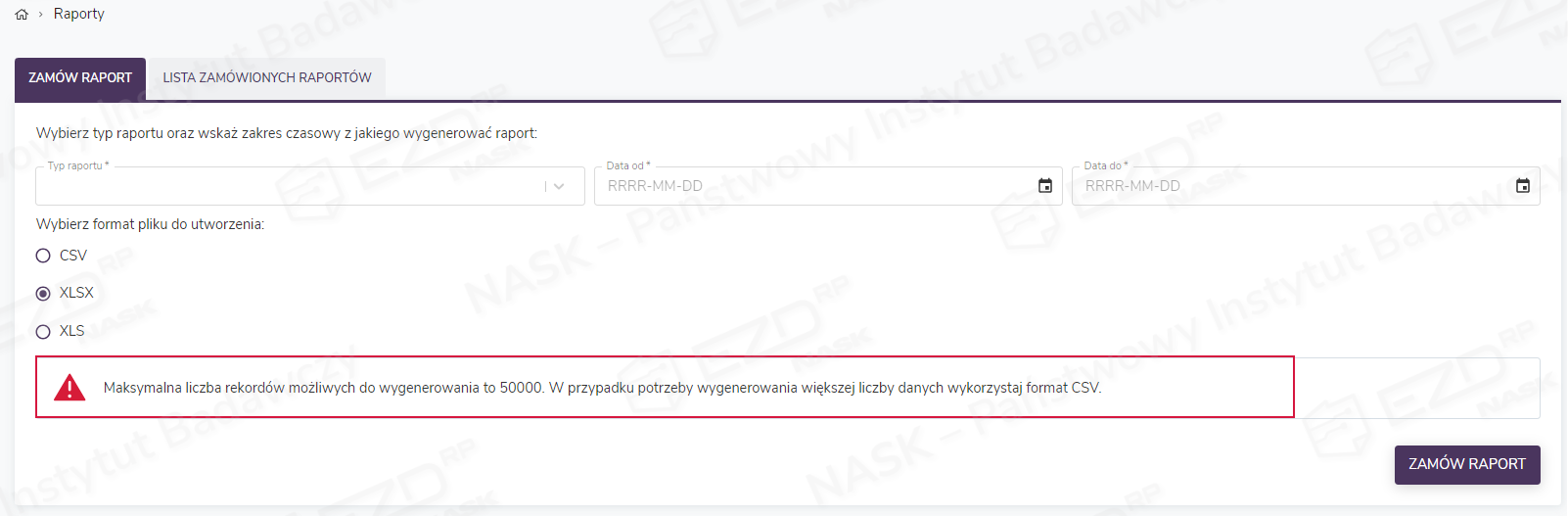 Formaty plików, w jakich mogą być generowane raporty, to CSV, XLS i XLSX. Jeśli jednak raport będzie zawierał więcej niż 50 000 rekordów, należy wybrać format CSV. Po zaznaczeniu opcji XLSX lub XLS system wyświetli informujący o ograniczeniach komunikat.