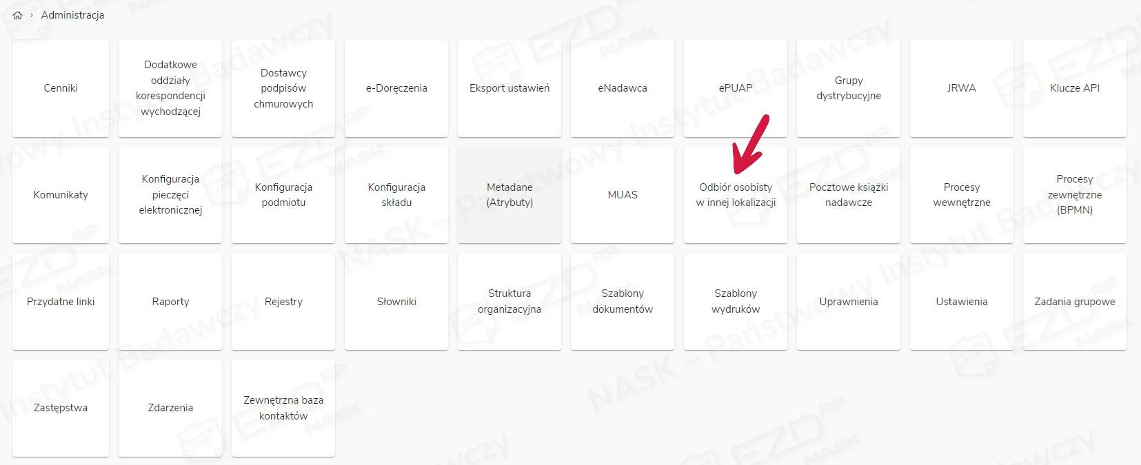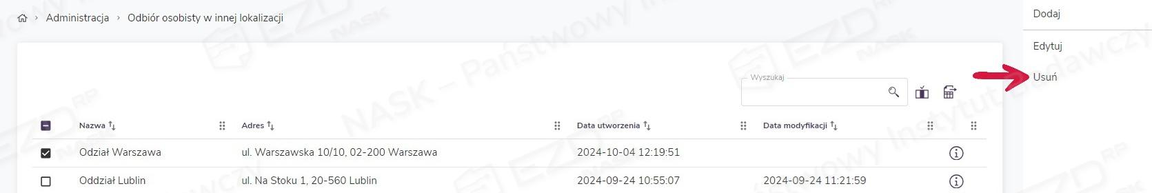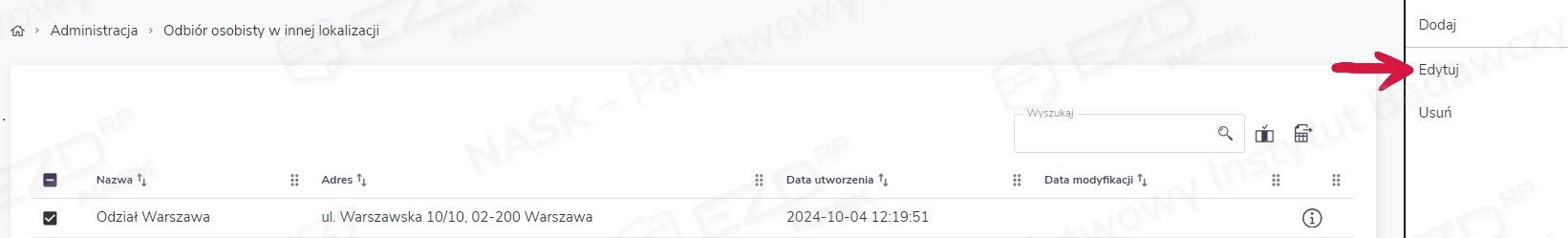 Aby móc zarządzać funkcją odbioru osobistego w różnych lokalizacjach, trzeba mieć nadane uprawnienie Administracja.OdbiorOsobistyInnaLokalizacja na poziomie Instytucja.