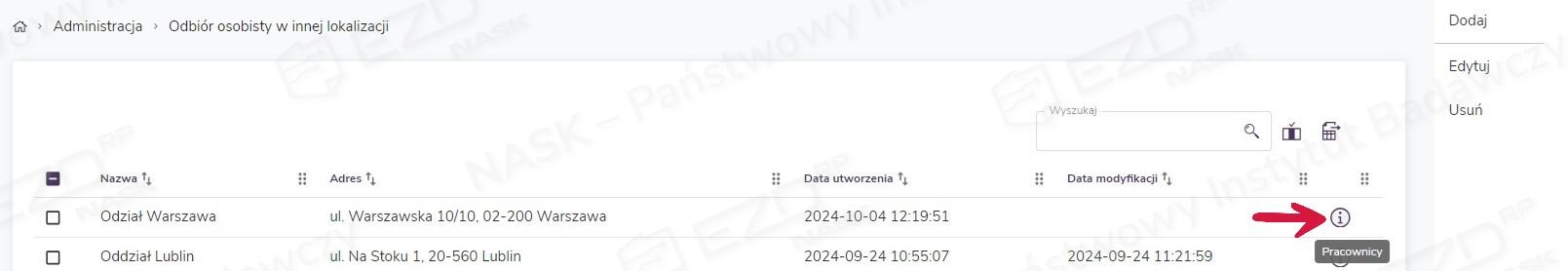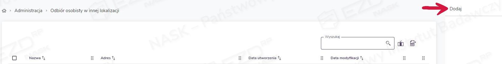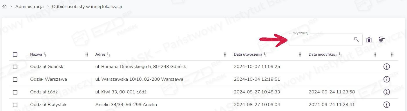 Dodane lokalizacje odbioru osobistego będą wyświetlane na liście wraz ze szczegółowymi informacjami na ich temat. Lista zawiera następujące kolumny: Nazwa, Adres, Data utworzenia, Data modyfikacji, znajduje się na niej też ikona informacyjna i. Użytkownik ma możliwość sortowania danych po wszystkich kolumnach z wyjątkiem ikony informacyjnej. Nad listą, w prawym górnym rogu, dostępne jest pole Wyszukaj, które pozwala na wyszukiwanie lokalizacji po polach NazwaAdres.