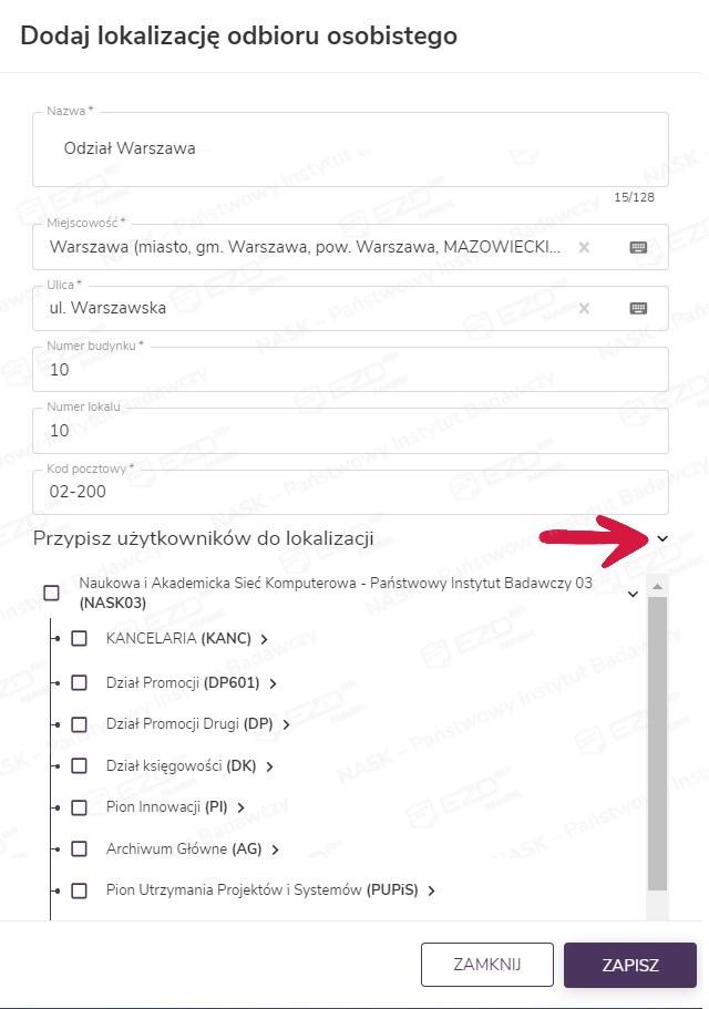 Dodatkowo w tym widoku dostępna jest możliwość przypisania do danej lokalizacji użytkowników. W tym celu trzeba kliknąć symbol rozwijania znajdujący się przy nagłówku Przypisz użytkowników do lokalizacji. System wyświetli wówczas aktualną strukturę podmiotu w formie drzewa. Należy wskazać w niej osoby, które mają być przypisane – przy czym jeden użytkownik może zostać powiązany z kilkoma lokalizacjami. Zaznaczenie pola wyboru przy nadrzędnej komórce w strukturze spowodowuje oznaczenie wszystkich użytkowników przypisanych do podlegających jej działów. Czynność należy zatwierdzić przyciskiem Zapisz.