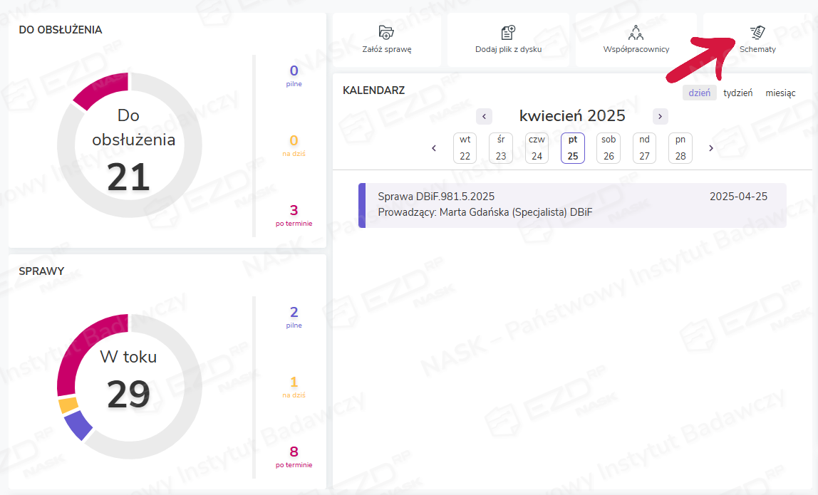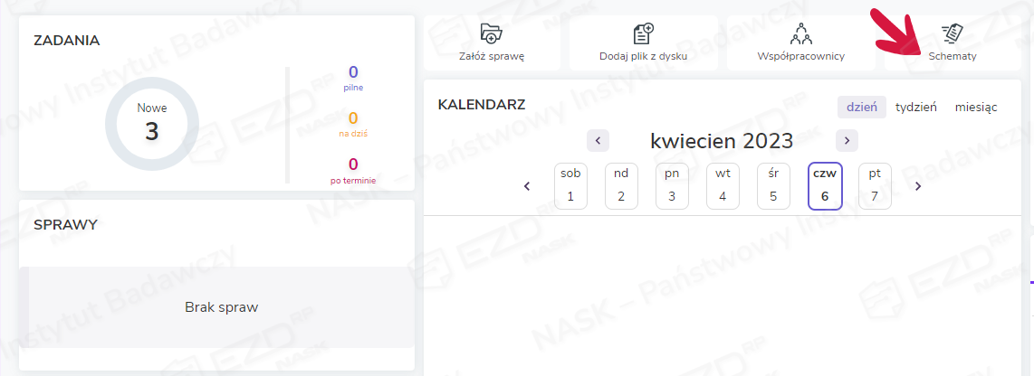Aby utworzyć własną listę seryjną w systemie EZD RP, należy kliknąć kafelek Schematy dostępny na stronie głównej systemu.