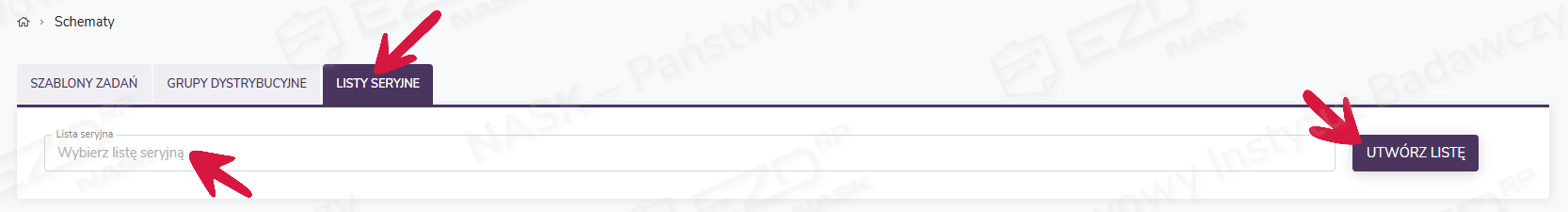 Następnie należy przejść do zakładki Listy seryjne. Kliknięcie pola Lista seryjna spowoduje, że wyświetlą się wszystkie istniejące już listy. Wpisanie nazwy w tym polu pozwala wyszukać konkretną listę w bazie. Jeśli nie znajdziemy interesującej nas listy, możemy utworzyć własną, klikając przycisk Utwórz listę.